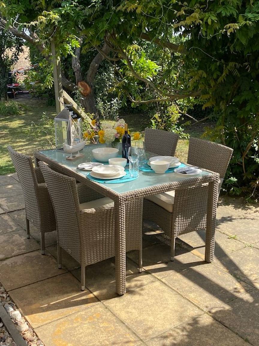 Der Außenbereich ist ausgestattet mit einem Teakholztisch und 4 Stühlen.