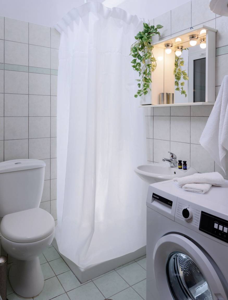 Badezimmer: Waschbecken, WC, Dusche, Fön, Waschmaschine.