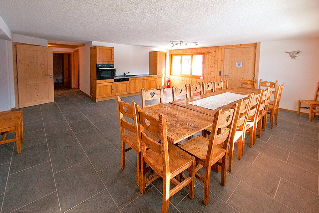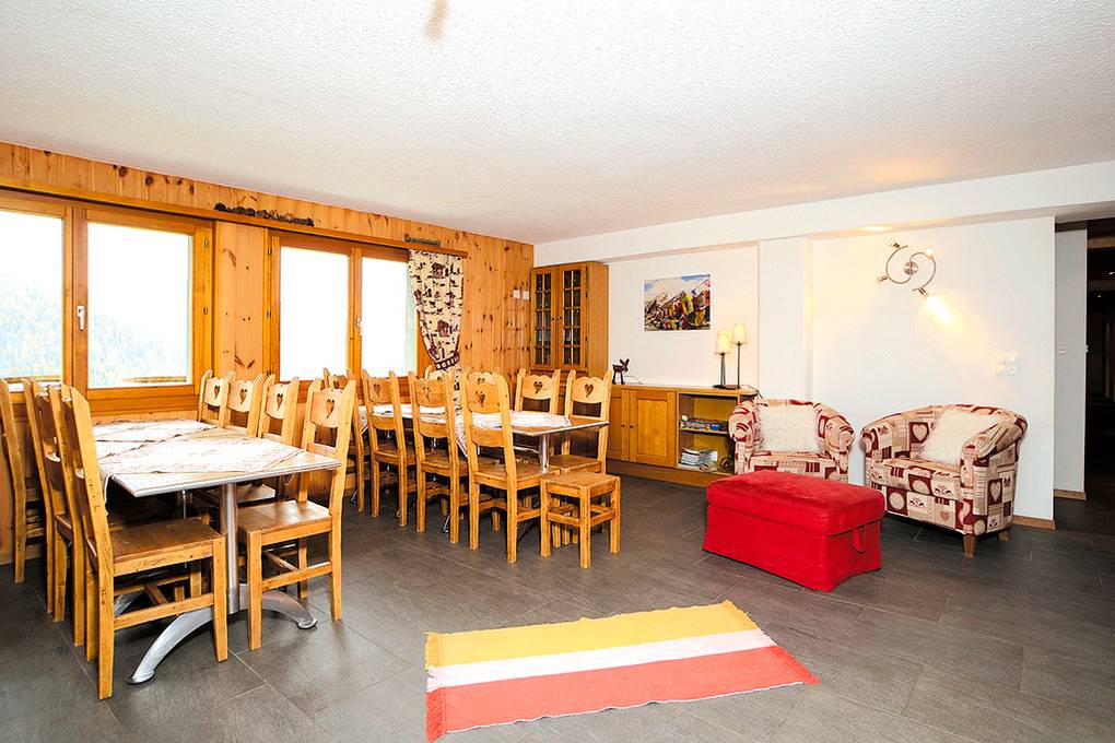 Parterre: Großzügige 7-Zimmerwohnung mit 180 qm Wohnfläche. Freundlicher Tagesraum mit Sitzecke, TV, Esstischen, gut ausgestatteter Küche. 4 Doppelzimmer mit Bad. Doppelzimmer. 6-Bettzimmer mit Doppelbett, Doppel-Etagenbett. Bad: Bw, Du, Wb, WC. Sonnenterrasse mit schönem Blick ins Tal und zum gegenüberliegenden Ort La Tzoumaz.