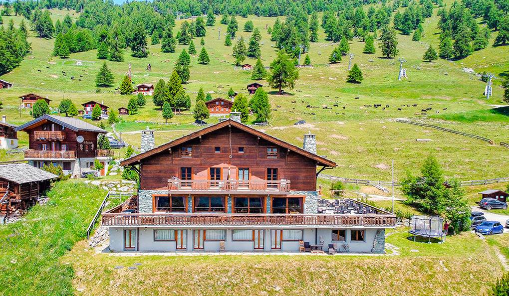 CH 383.73 Chalet 20-38 Pers.: Bei gemeinsamer Anmietung aller vier Wohnungen ergibt sich ein Chalet zum Alleinbewohnen in einzigartiger Lage. Insgesamt 18 Zimmer mit 488 qm Wohnfläche, verteilt auf 4 Fewos und 3 Etagen. 14 Schlafräume, 4 Wohnräume. Gemeinsames Essen für max. 12 und 20 Personen in den Wohnräumen der beiden größeren Wohnungen möglich.