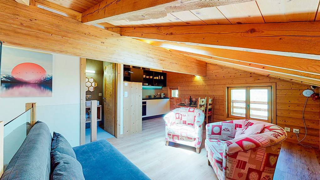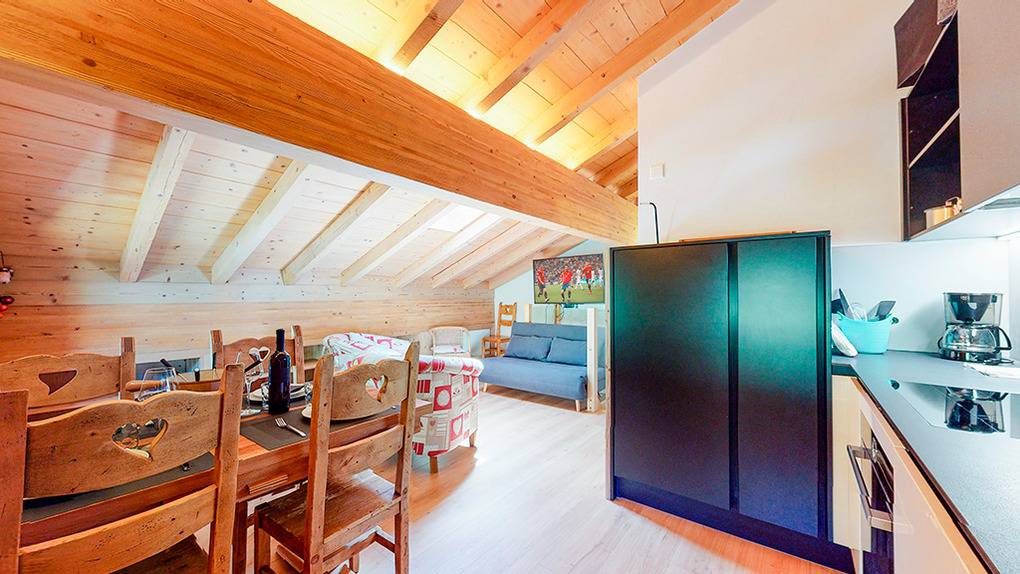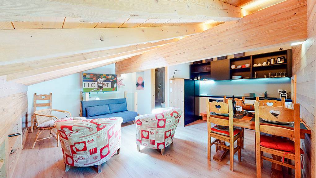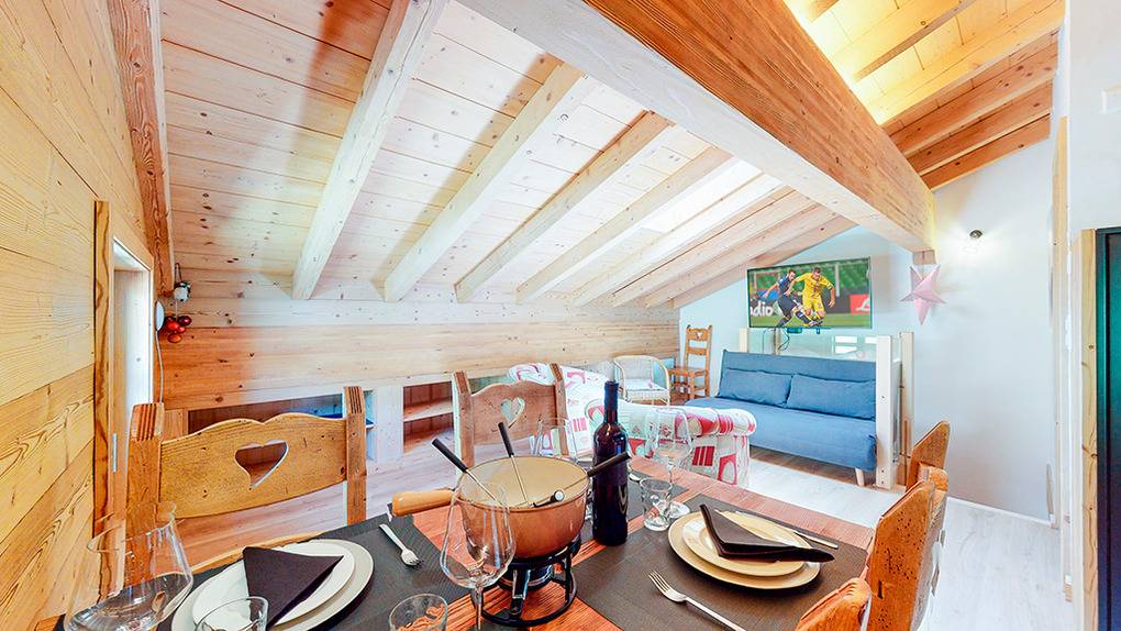 CH 383.71 Wohnung 8-10 Pers.: 5-Zimmerwohnung mit 160 qm Wohnfläche über 2 Etagen. 2. Etage: Großzügiger Wohnraum mit gemütlicher Sitzgruppe (Schlafsofa 2 Pers.), Kaminofen, TV, Esstisch, Einbauküche (Backofen, Mikrowelle, Spülmaschine), Balkon. Zwei Doppelzimmer mit Bad (Du bzw. Bw, Wb, WC). Dachgeschoss mit Schrägen: Zwei Doppelzimmer mit Bad (Du bzw. Bw, Wb, WC). Balkon mit schönem Blick ins Tal und zum gegenüberliegenden Ort La Tzoumaz.