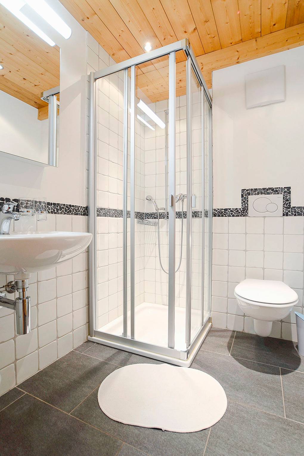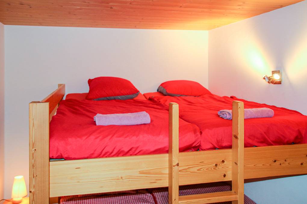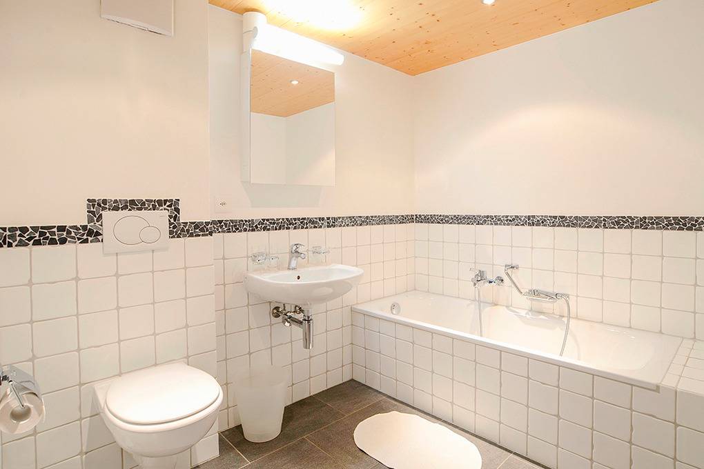 CH 383.70 Wohnung 4-6 Pers.: 3-Zimmerwohnung mit 73 qm Wohnfläche über 2 Etagen. 2. Etage: Zwei Doppelzimmer. Bad: Bw/Du, Wb, WC. Dachgeschoss mit Schrägen: Wohnraum mit Couchgarnitur (Schlafsofa 2 Pers.), TV, Esstisch, Einbauküche (Backofen, Mikrowelle, Spülmaschine). Bad: Du, Wb, WC.