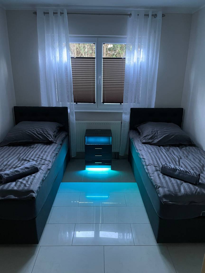2 Einzelbetten mit den Maße 90x200 (auf Wunsch können auch als Doppelbett genutzt werden)