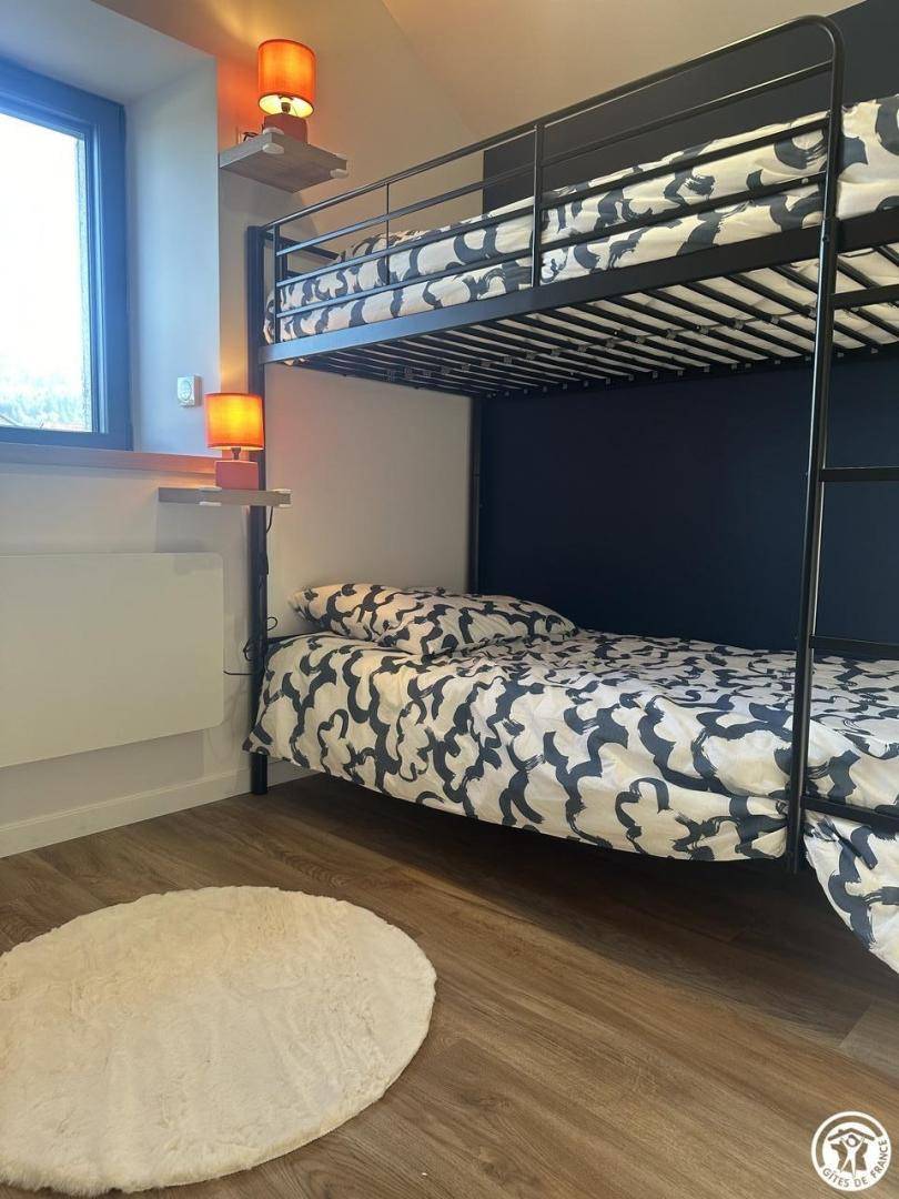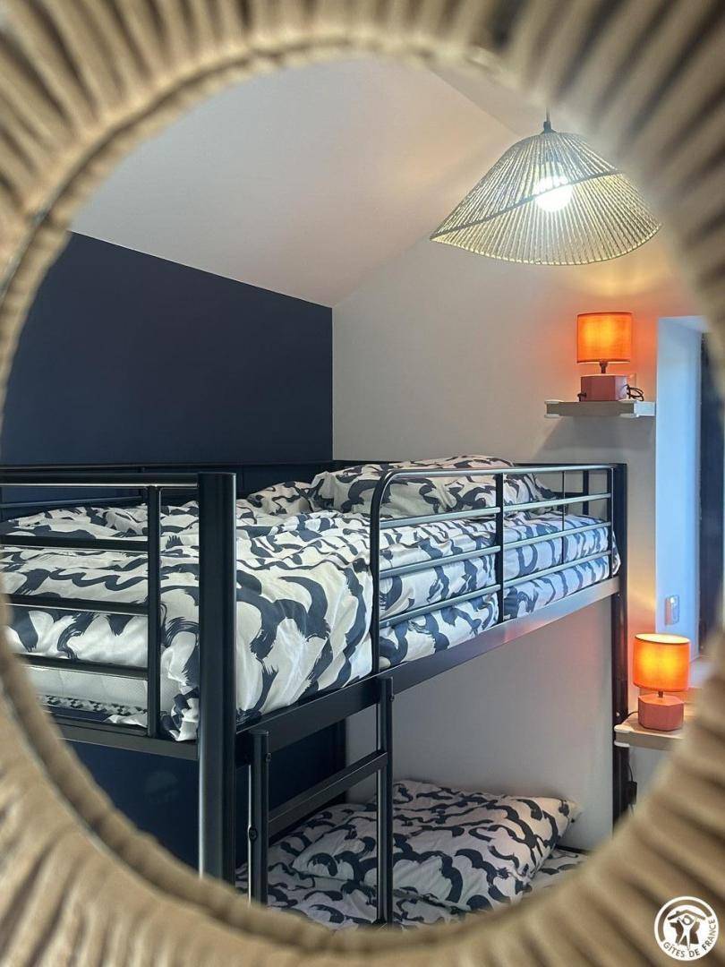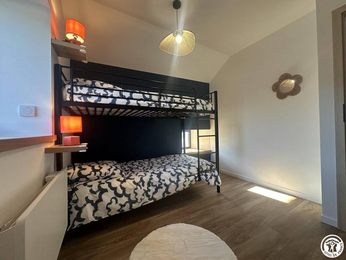1. Etage: 1 Schlafzimmer in Schokoladentönen mit einem Doppelbett und 1 zweites Schlafzimmer in Anthrazittönen mit zwei Etagenbetten, ideal für Kinder oder Freunde. Duschraum mit WC.
