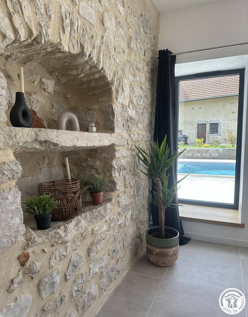 Dieses warme Ferienhaus für 6 Personen mit 2 Schlafzimmern kombiniert auf elegante Weise freiliegenden Stein, Naturholz und beruhigende Farben und bietet so eine authentische und freundliche Atmosphäre.