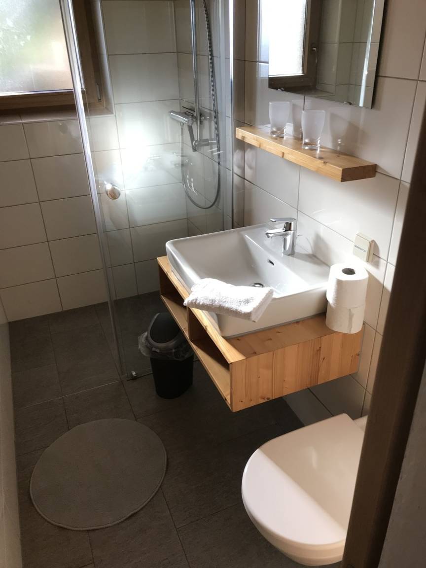 Badezimmer mit Dusche, Waschbecken & WC