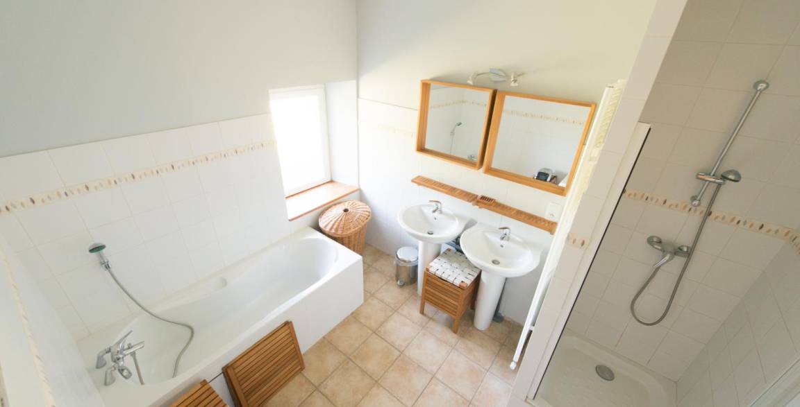 Ferienunterkunft im Erdgeschoss: gut ausgestattete Küche, Wohnzimmer mit Schlafsofa, 2 Schlafzimmer (1 Bett 140 cm) (2 Betten 90 cm), Badezimmer (Dusche + Badewanne), separates WC.