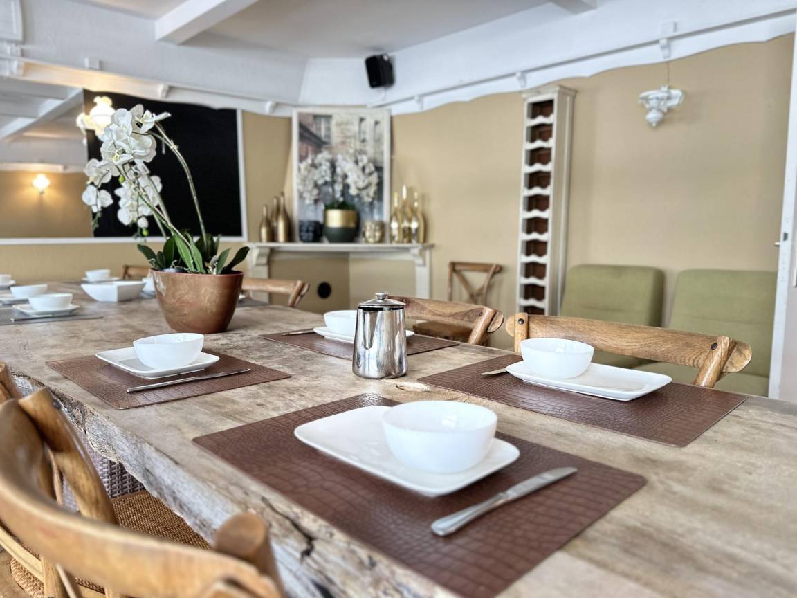 Layout : Parterre: Aufenthaltsraum mit TV , Esszimmer mit Bar , Küche mit Wasserkocher, Kochherd(4 Kochplatten, Induktion), Kaffeemaschine(Filter), 2x Backofen, Mikrowelle, Geschirrspüler, Kühlschrank, Waschmaschine , Toilette, Spielzimmer mit Tischtennisplatte, Tischfußball, Billard