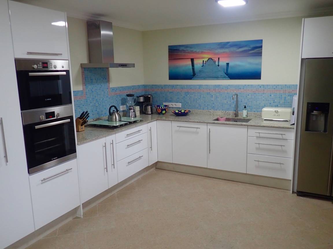Im Apartment befindet sich zusätzlich zu den Schlafzimmern ein großes Wohnzimmer mit separatem Essbereich. Die Küche ist mit allem ausgestattet was man im Urlaub braucht, wie Kühl- / Gefrierschrank incl. Icemaker, Mikrowelle, Backofen, Gasherd, Spülmaschine, Kaffeemaschine, Smoothie-Mixer, Geschirr, Gläser und Besteck für 8 Personen.