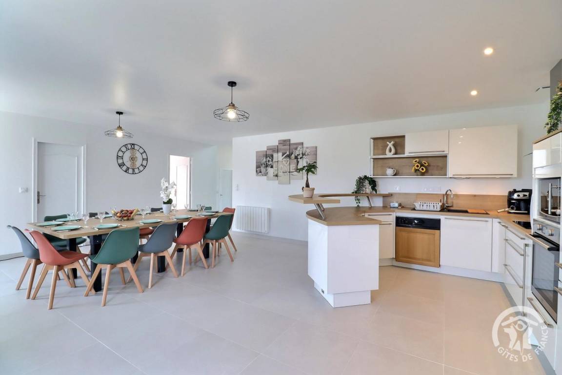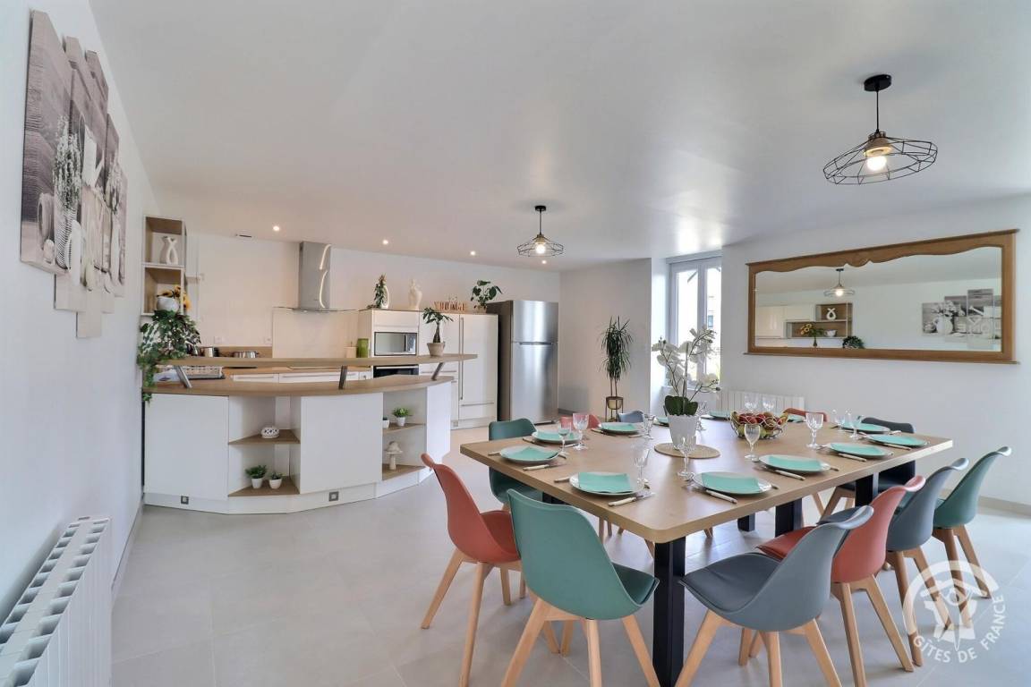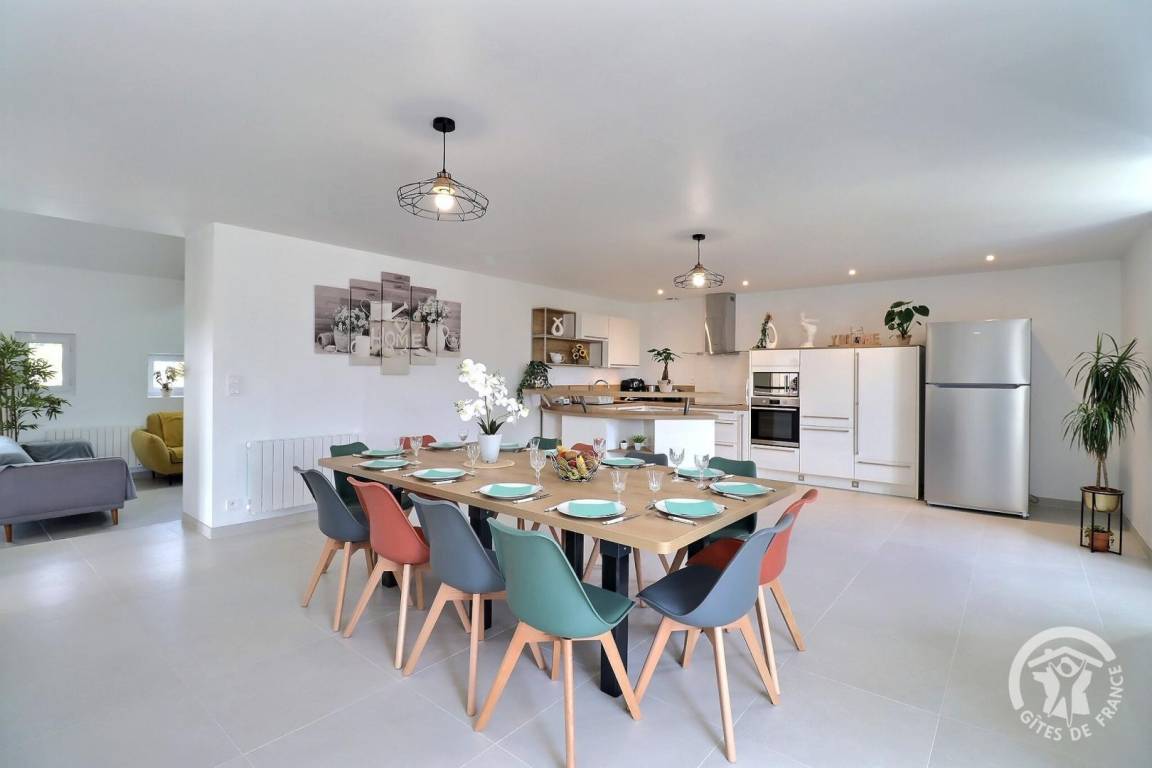 „Tout est fait pour pouvoir farnienter entre amis ou en famille: Plusieurs lieux ou des mini groupes peuvent se retrouver ou des grandes tablées si on veut être tous ensemble. Bien équipé en cuisine. Plusieurs salles de bains et toilettes pour faciliter l’existence en groupe dans un lieu propre et une décoration minimaliste mais apaisante, ce qui fait réellement le charme du gîte.“