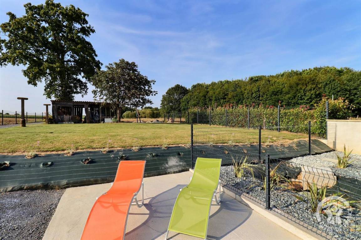 - auf der Wohnzimmerseite ein Außenbereich mit Sonnenliegen, Grundstück mit Rasen
