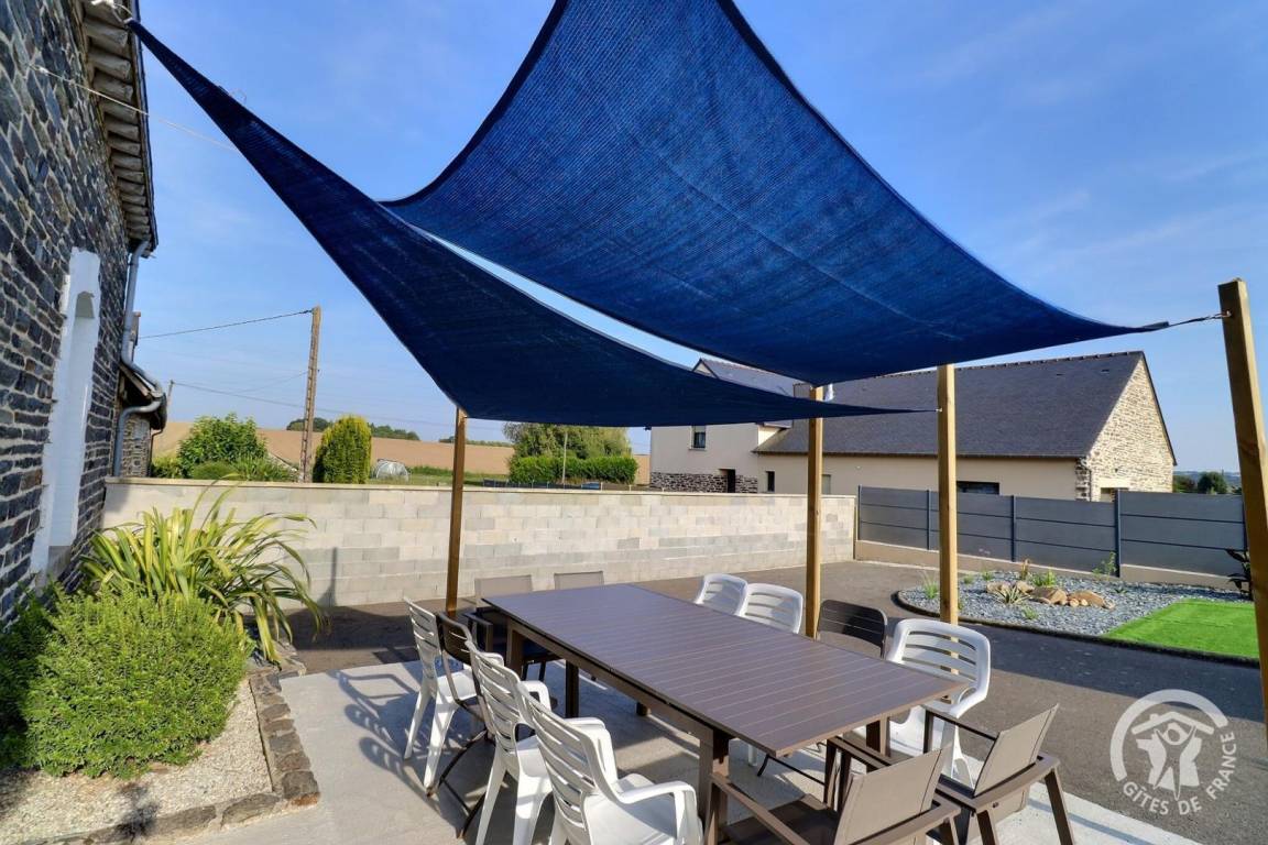 - auf der Küchenseite eine Terrasse mit Gartenmöbeln, Sonnensegel und Grill