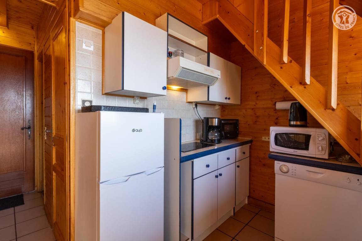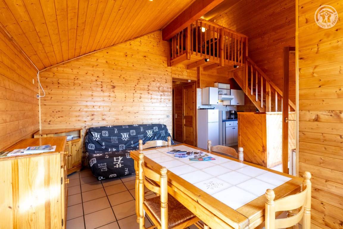 Wohnung im 1. Stock im Haus der Eigentümer neben einer zweiten Wohnung. Zugang über Außentreppe. 1. Stock: Eingang, Wohnzimmer – Küche mit Zugang zum Balkon, 1 Schlafzimmer (1 Doppelbett 140 x 190 cm), Badezimmer (Dusche), separates WC, Schlafzimmer im Zwischengeschoss (2 Doppelbetten 140 x 190 cm). Privater Parkplatz. Wohnfläche: 51m².
