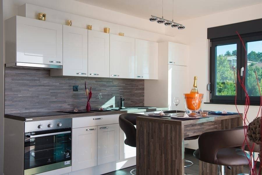 Voll ausgestattete Designerküche von DAN mit Kaffeemaschine, E-Herd mit Glaskeramikceranfeld und Backrohr, Kühlschrank mit Gefrierfach,