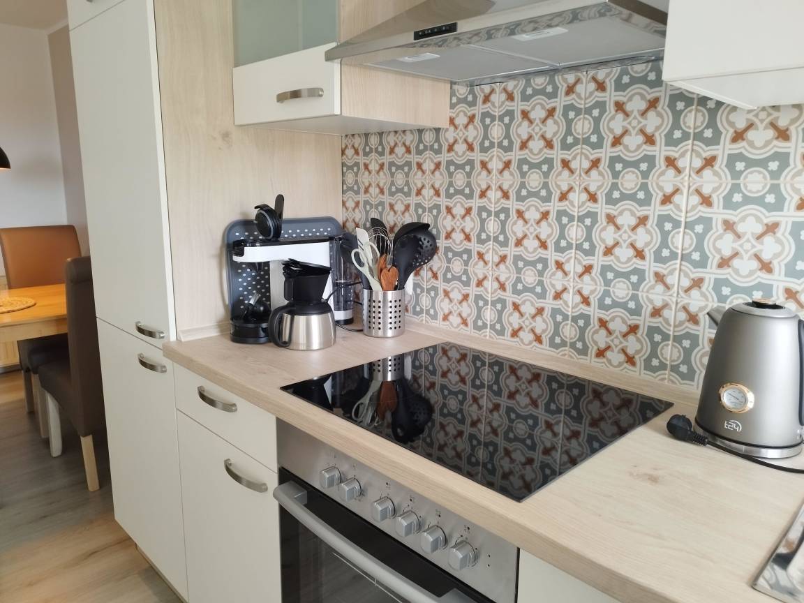 Mit ca 58 qm verfügt sie über ein Elternschlafzimmer mit Doppelbett (180 cm), ein Zimmer mit Einzelbett, ein Bad und einen gemütlichen Ess-/Wohnbereich mit integrierter Küchenzeile und bequemen Sitzmöglichkeiten. Die Küche ist ausgestattet mit Wasserkocher, Cerankochfeld, Backofen, Toaster und einer Kombi Senseo Kaffeemaschine.