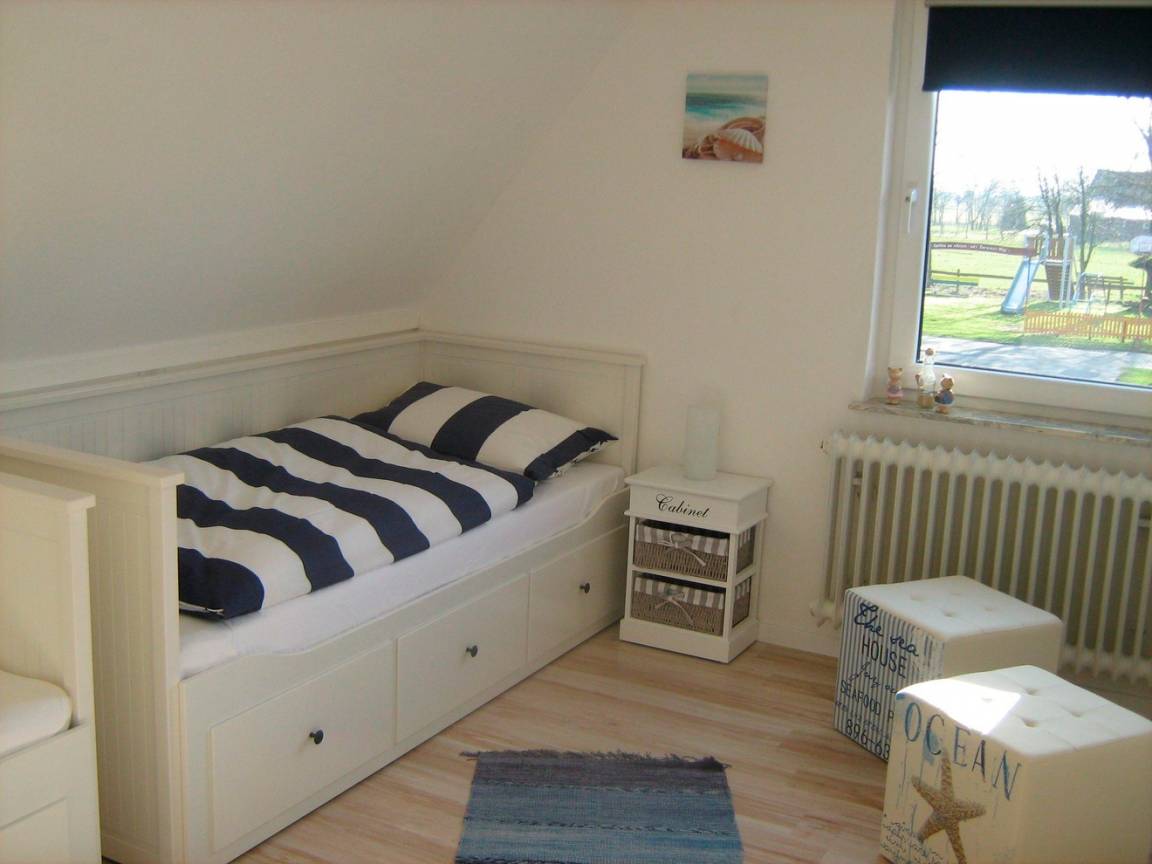 In dem zweiten Zimmer sind zwei einzelne Betten mit 80 cm Breite und für Kinder und Erwachsene geeignet. Auf Anfrage kann ein Bett zu einem 1,60 m Bett umgebaut werden. Somit können hier drei Personen schlafen.