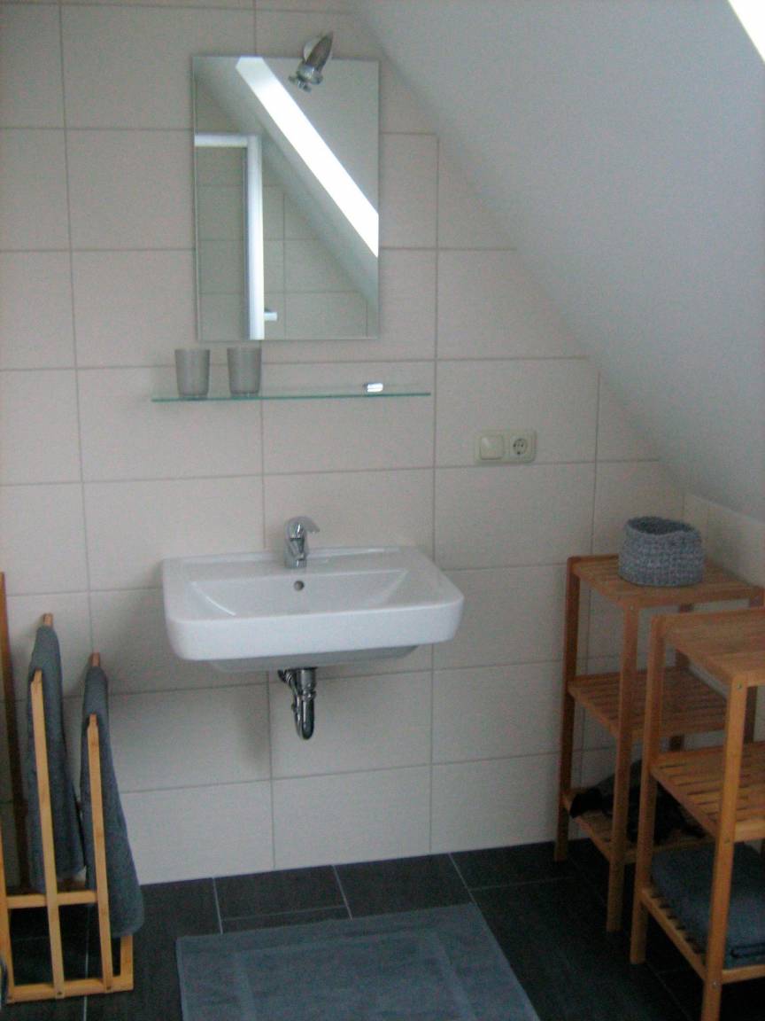 Im Erdgeschoß befindet sich eine Gäste-Toilette. Das neue Dusch-Badezimmer mit Toilette liegt im Obergeschoß bei den Schlafzimmern.