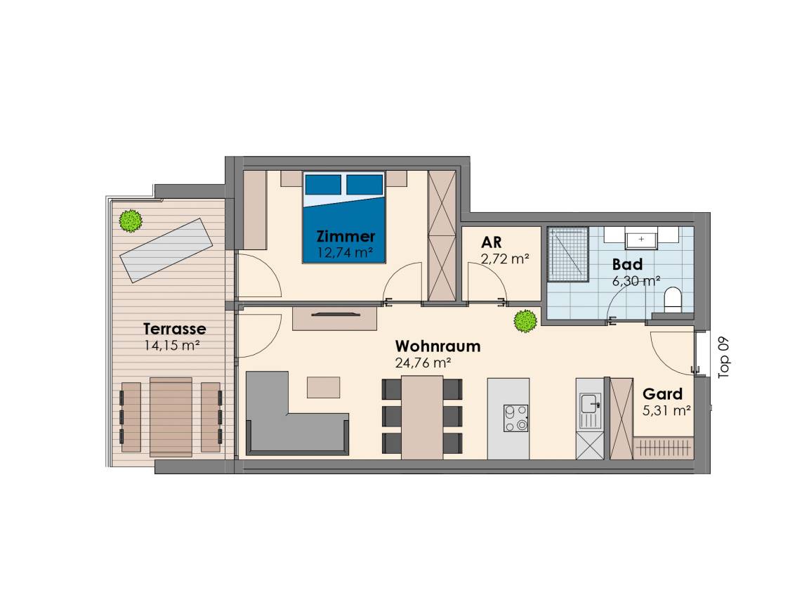Layout : In der 2. Etage: offene Küche mit Kochplatte, Wasserkocher, Kochherd(4 Kochplatten, Induktion), Kaffeemaschine(nespresso cups), Backofen, Mikrowelle, Geschirrspüler, Kühl-/Gefrierkombination , Wohn/Esszimmer mit TV, Esstisch(6 Personen), Sitzecke , Schlafzimmer mit Doppelbett , Badezimmer mit Dusche, Waschbecken, Toilette , Abstellraum(2 m²), Terrasse(14 m²)