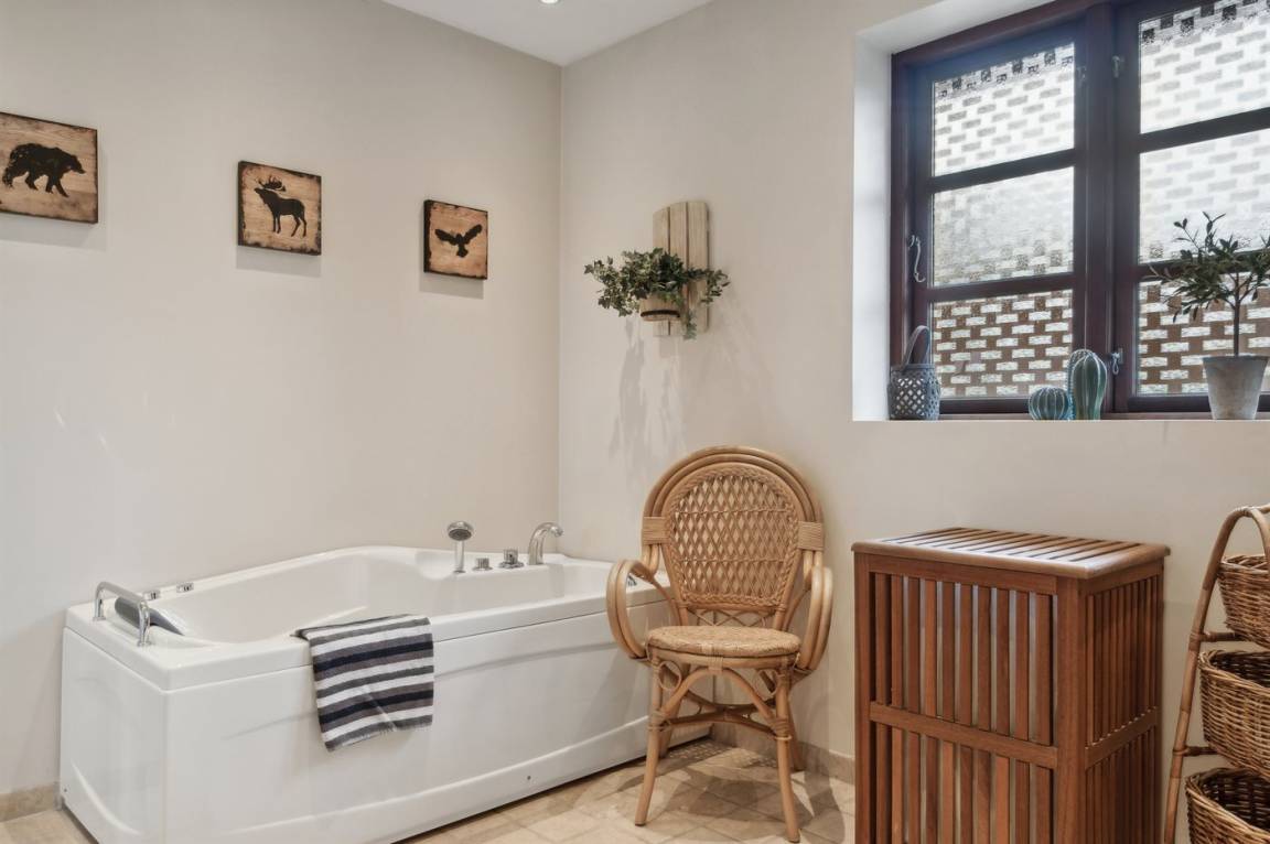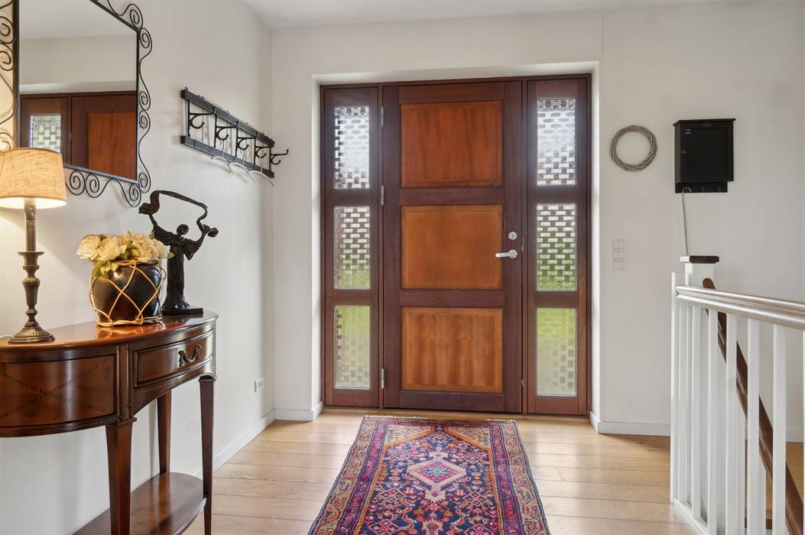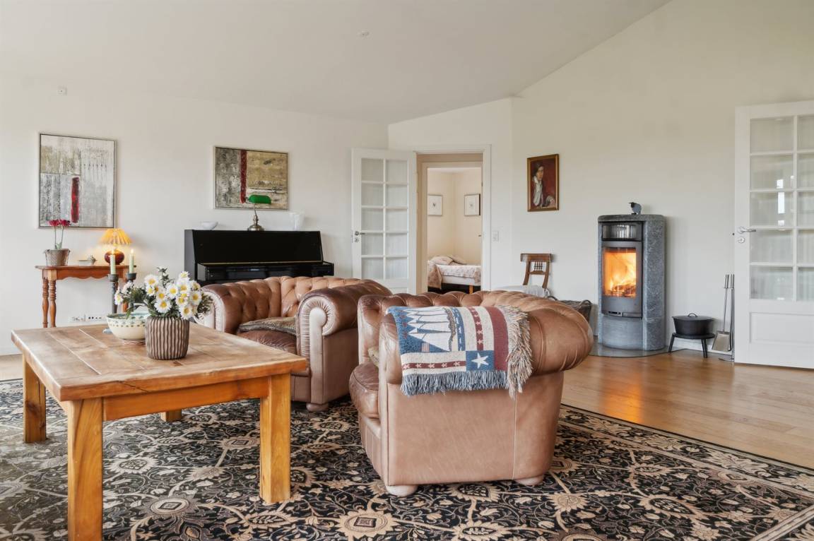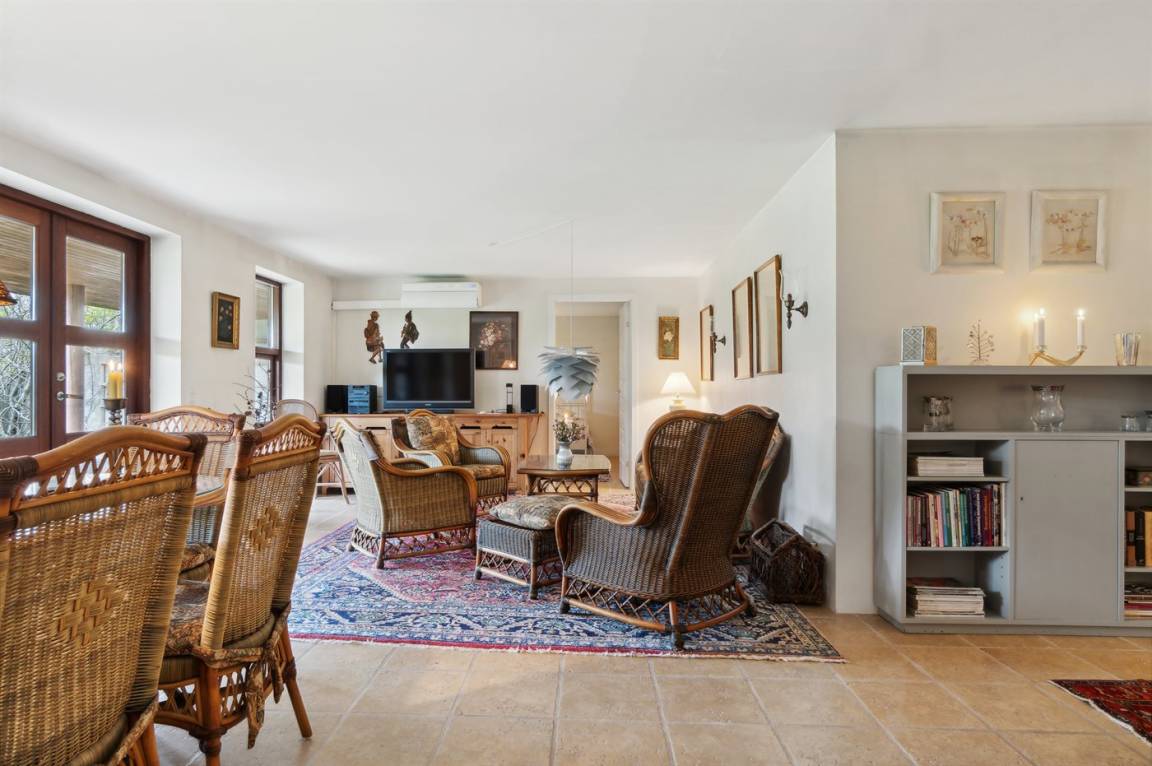 Während das eine Wohnzimmer mit einem Klavier, Chesterfield-Sofa und Stühlen ausgestattet ist, ist das Wohnzimmer im Untergeschoss mit feinen Korbmöbeln eingerichtet. Im Untergeschoss gibt es außerdem eine Waschküche, und auf beiden Etagen gibt es Esstische. Das Haus eignet sich daher perfekt für mehrere Generationen.