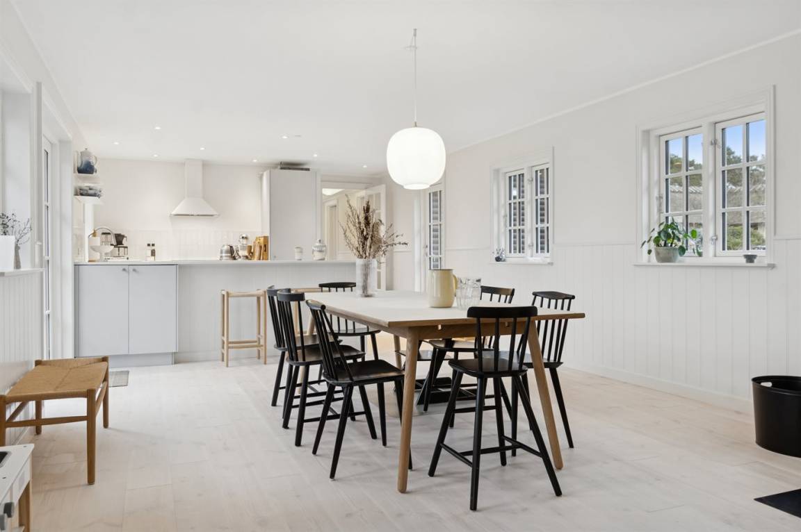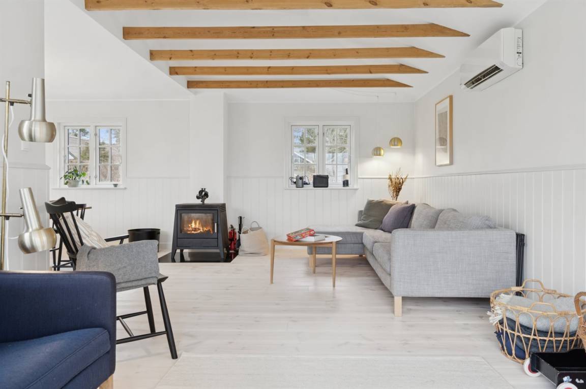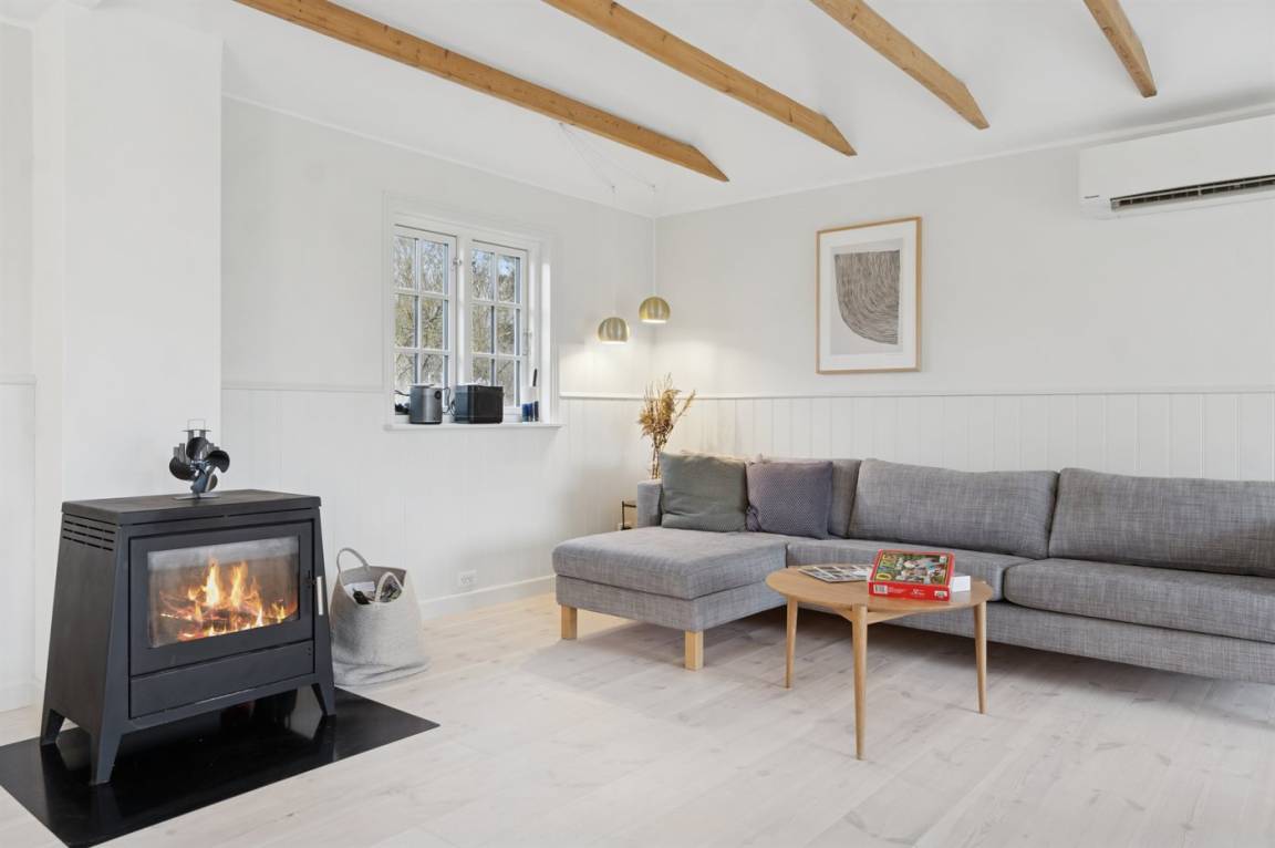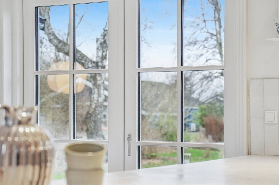 Das Haus wirkt hell und einladend mit einer gepflegten und modernisierten Einrichtung, in der Wohnzimmer und Küche harmonisch ineinander übergehen. Hier wurde auf die Details geachtet, und eine behutsame Modernisierung macht das Haus sowohl funktional als auch gemütlich und einladend, – ohne dass der ursprüngliche Ferienhaus-Charme verloren gegangen ist. Große Fenster lassen viel Licht herein und ermöglichen dir den Blick in den Garten.