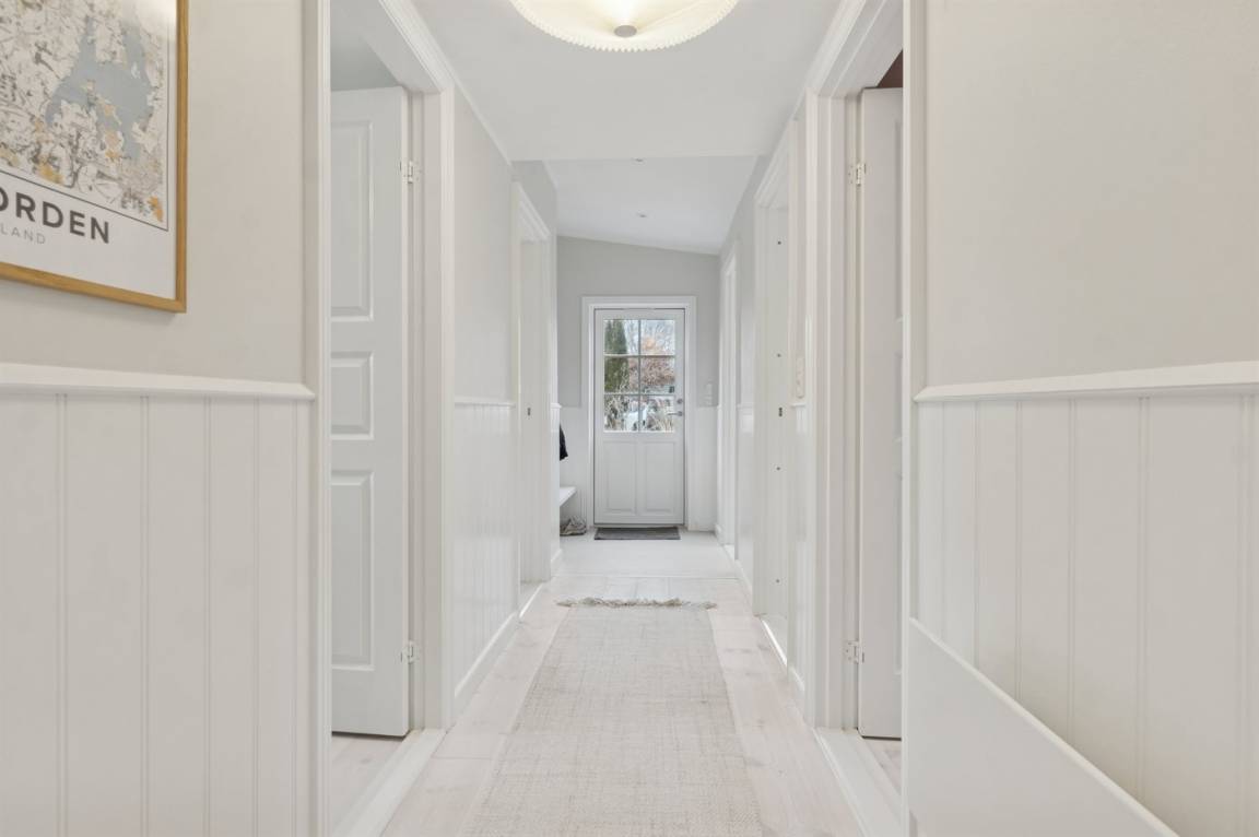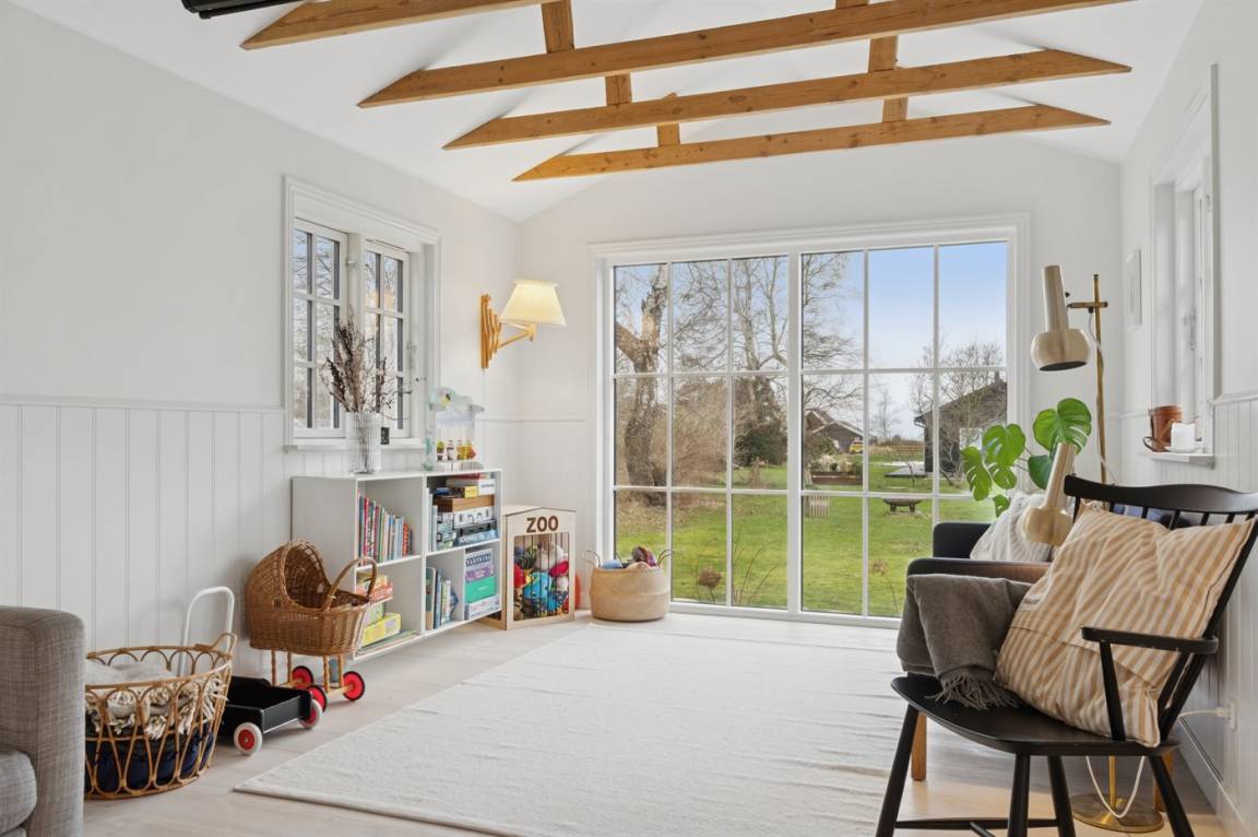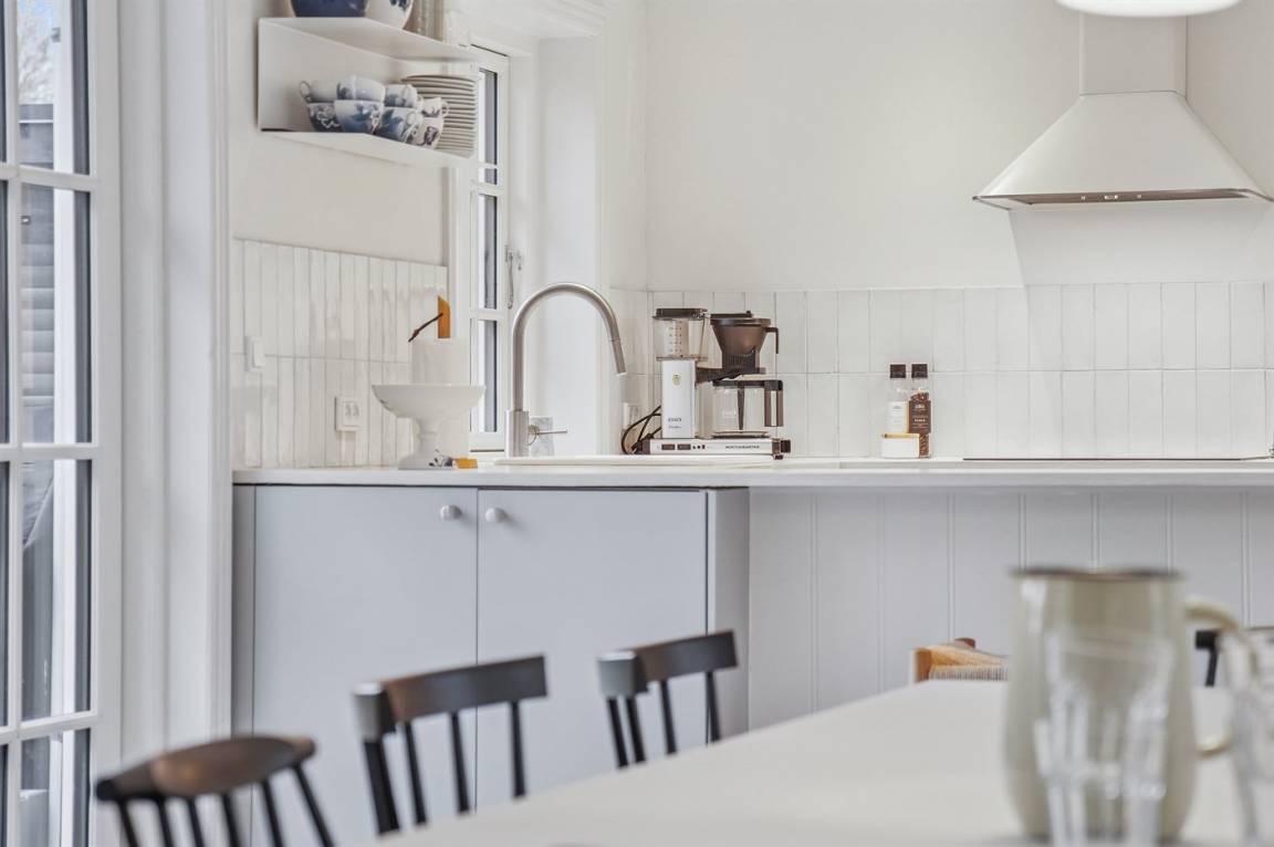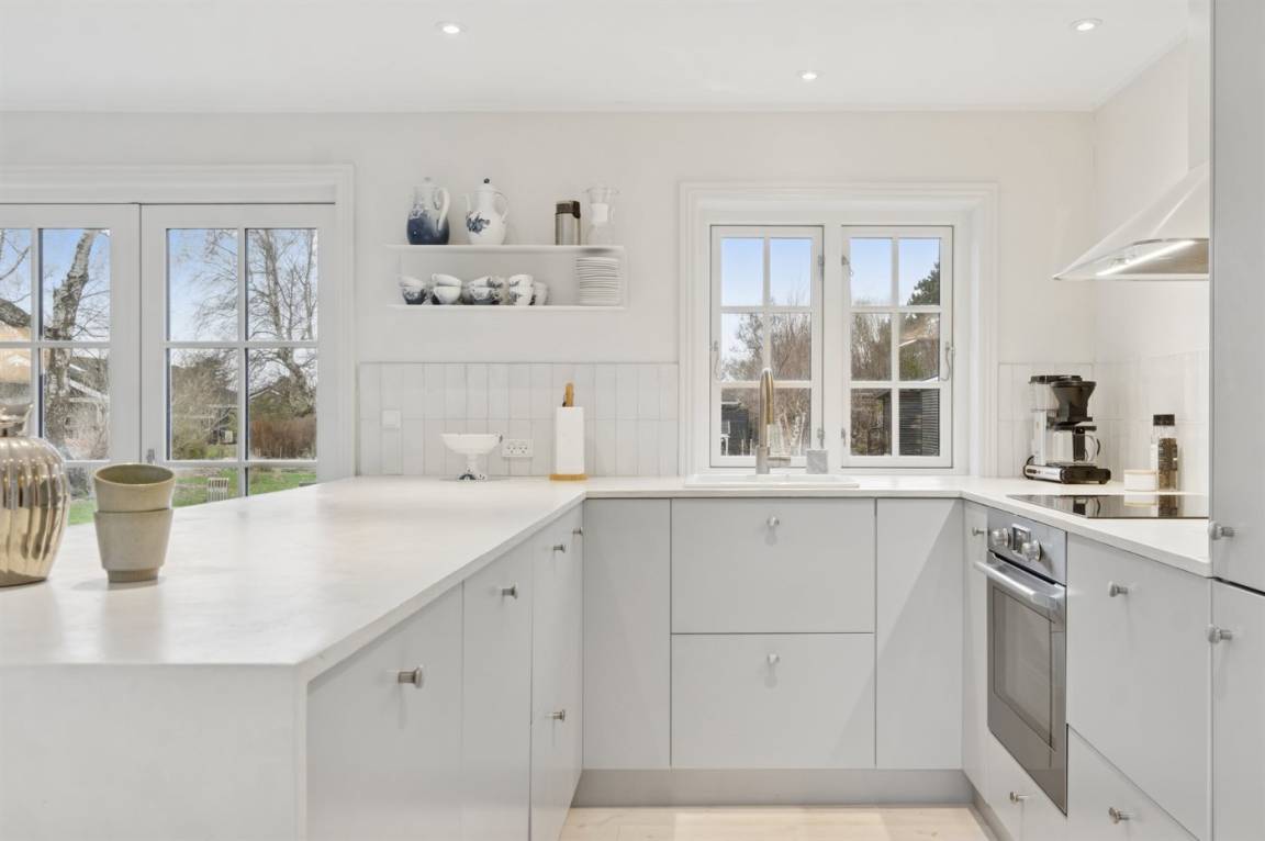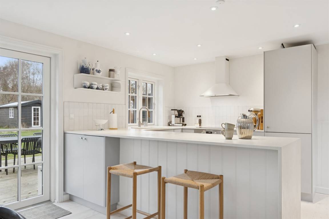 Das Haus wirkt hell und einladend mit einer gepflegten und modernisierten Einrichtung, in der Wohnzimmer und Küche harmonisch ineinander übergehen. Hier wurde auf die Details geachtet, und eine behutsame Modernisierung macht das Haus sowohl funktional als auch gemütlich und einladend, – ohne dass der ursprüngliche Ferienhaus-Charme verloren gegangen ist. Große Fenster lassen viel Licht herein und ermöglichen dir den Blick in den Garten.