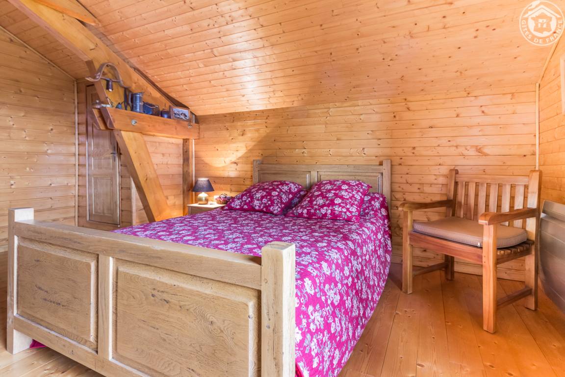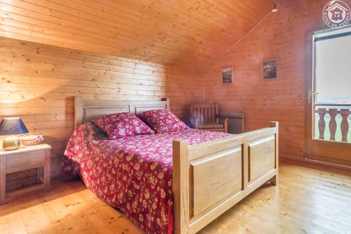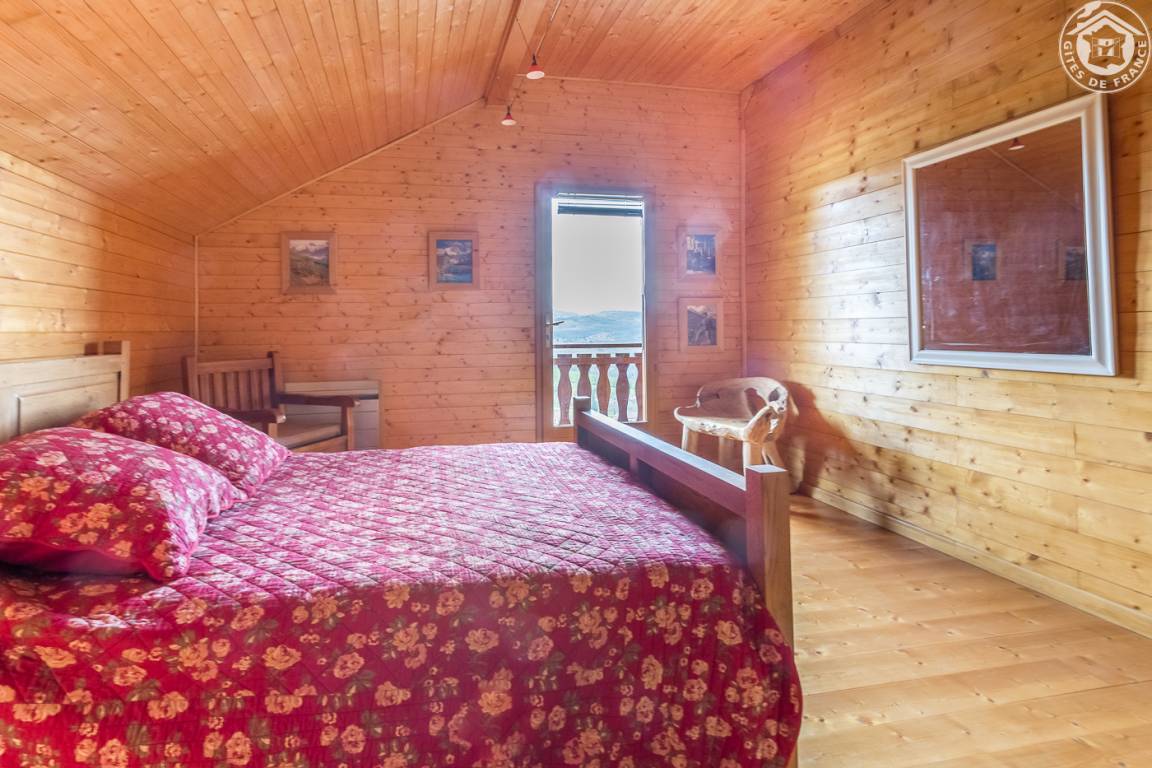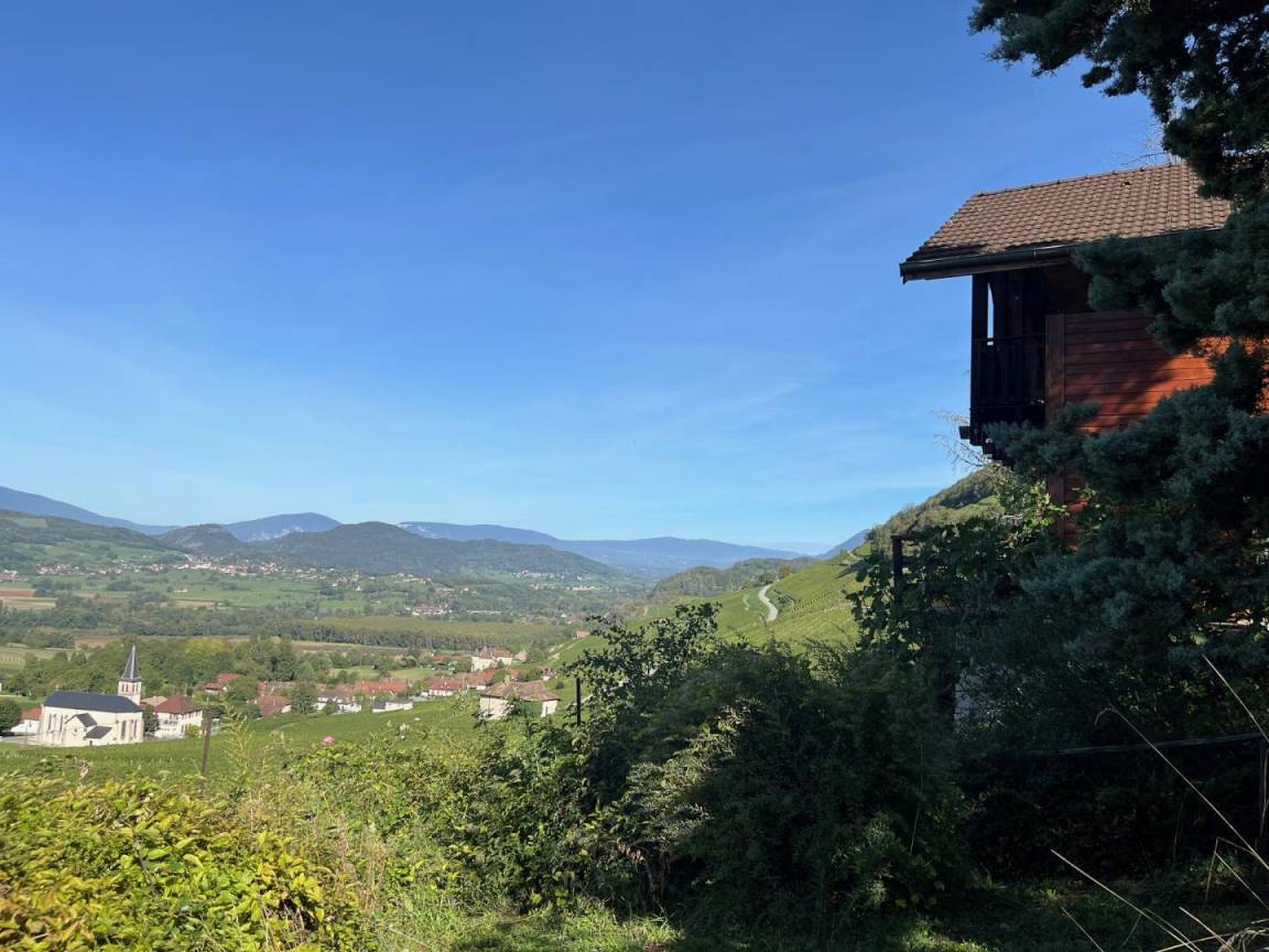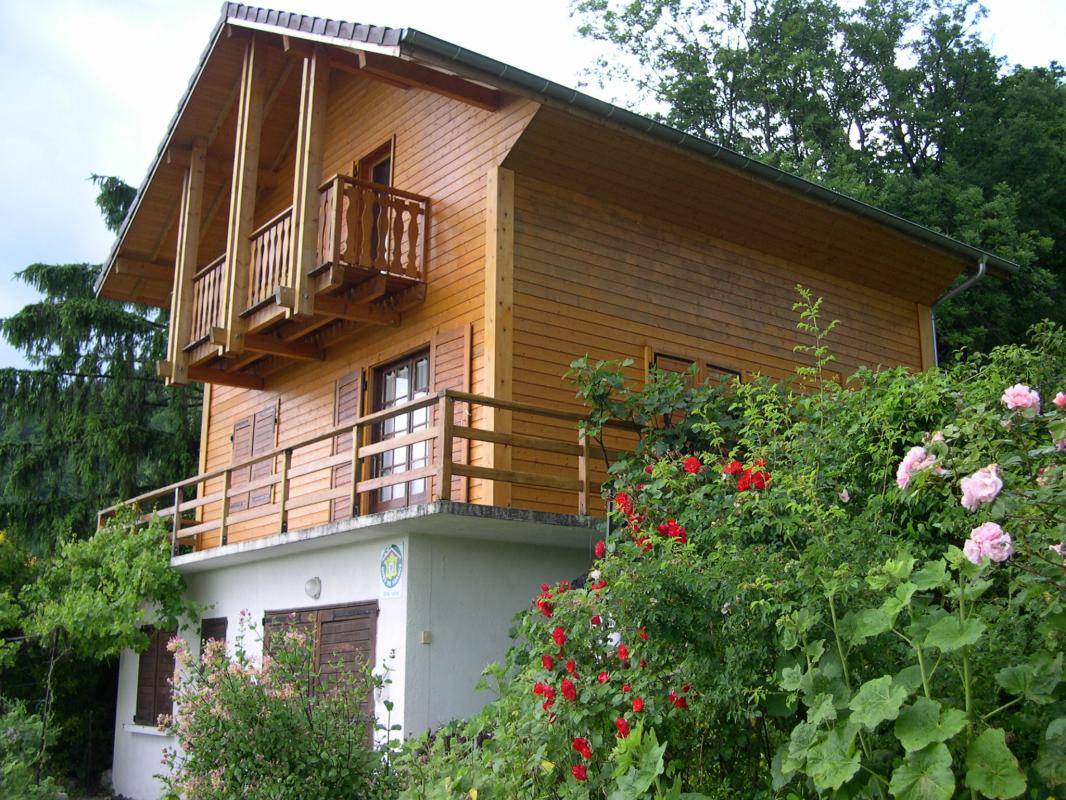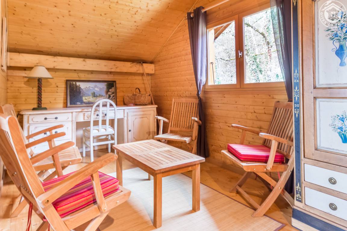 Individuelles Chalet auf 2 Ebenen (Zugang von außen). 1. Etage: Wohnzimmer, kleine Küche, 1 Schlafzimmer (1 Doppelbett), Badezimmer (Hufbad mit WC). 2. Etage: Entspannungsbereich im Zwischengeschoss, 2 Schlafzimmer (2 Doppelbetten). Doppelbalkon + Terrasse + sanft abfallendes Grundstück. Zufahrt über steinigen Weg über 200m. Landschaftssee St. Jean de Chevelu 7 km. Strände + Segeln Lake Bourget 14 km.