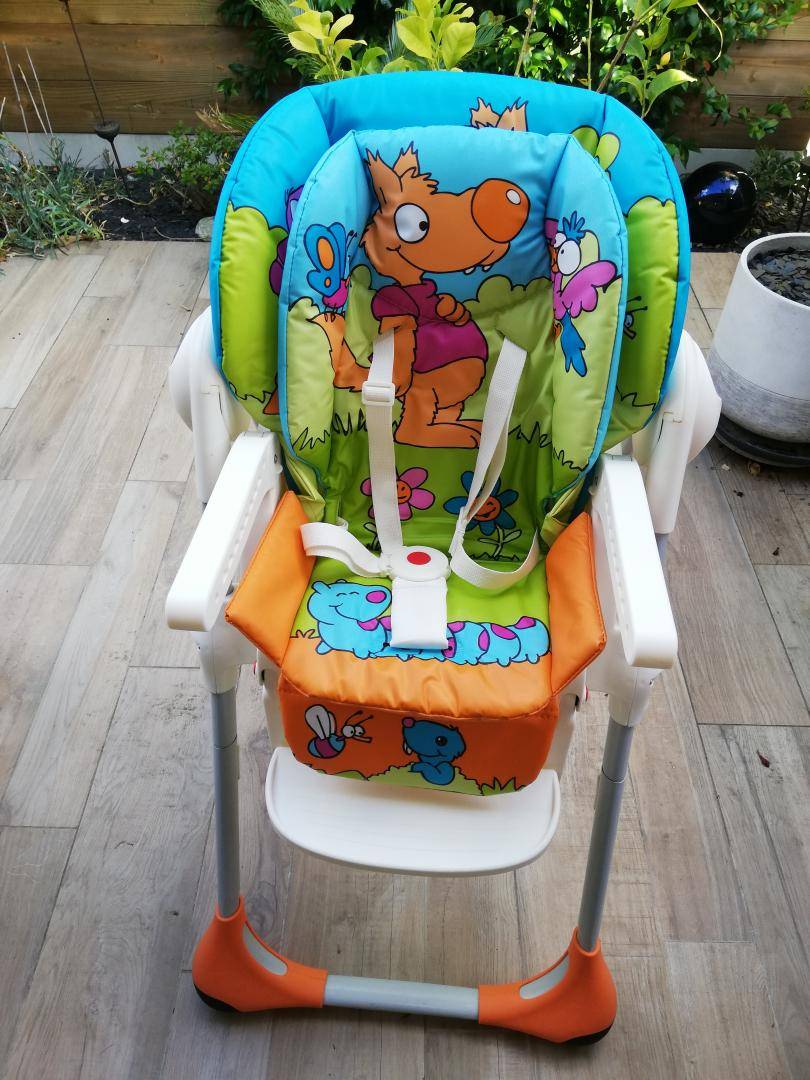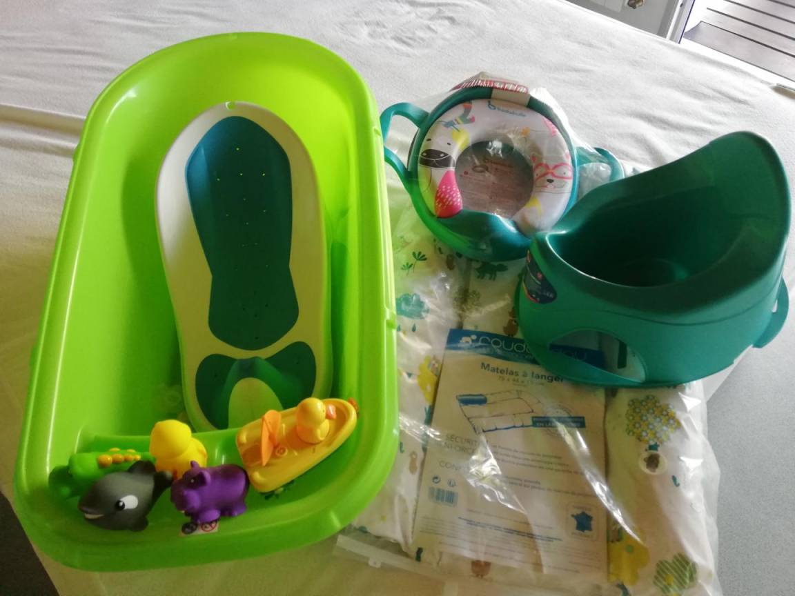 Babyausstattung vorhanden: Hochstuhl, WC-Aufsatz, Babybadewanne, Töpfchen.