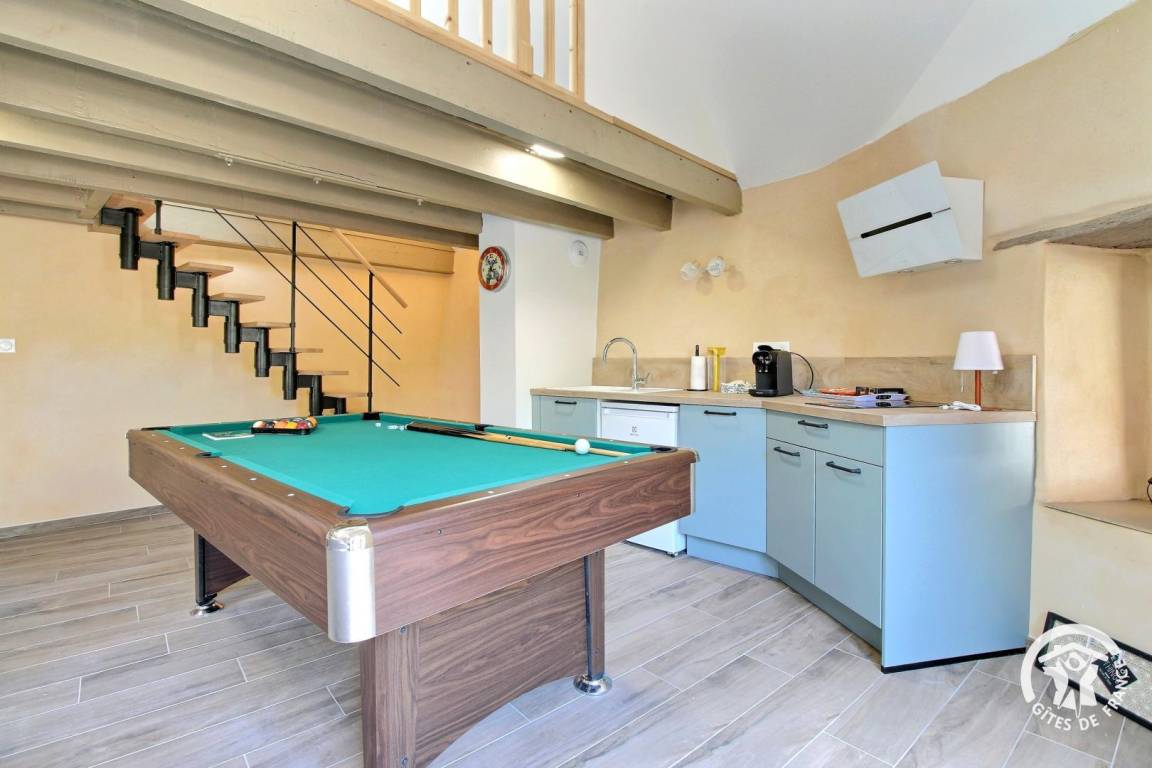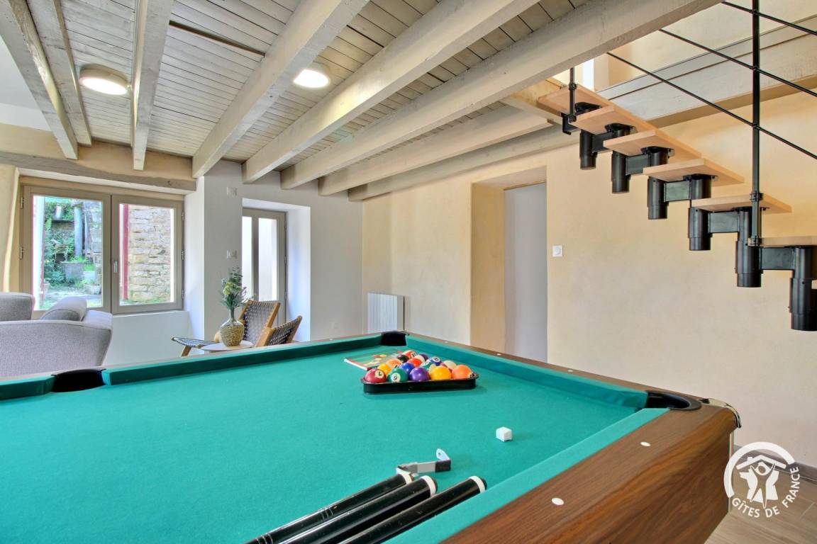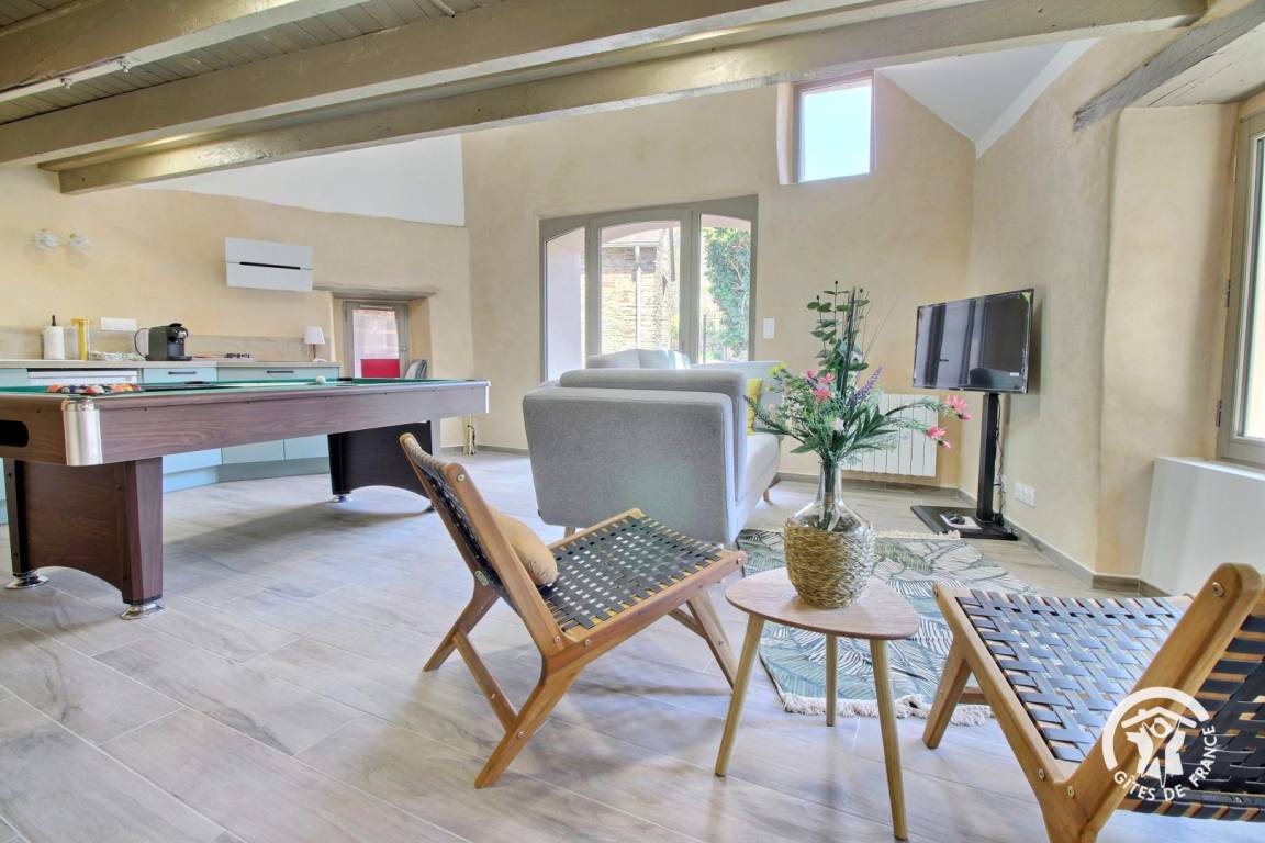 - Loungebereich mit Billardtisch und Sommerküche mit Blick nach draußen