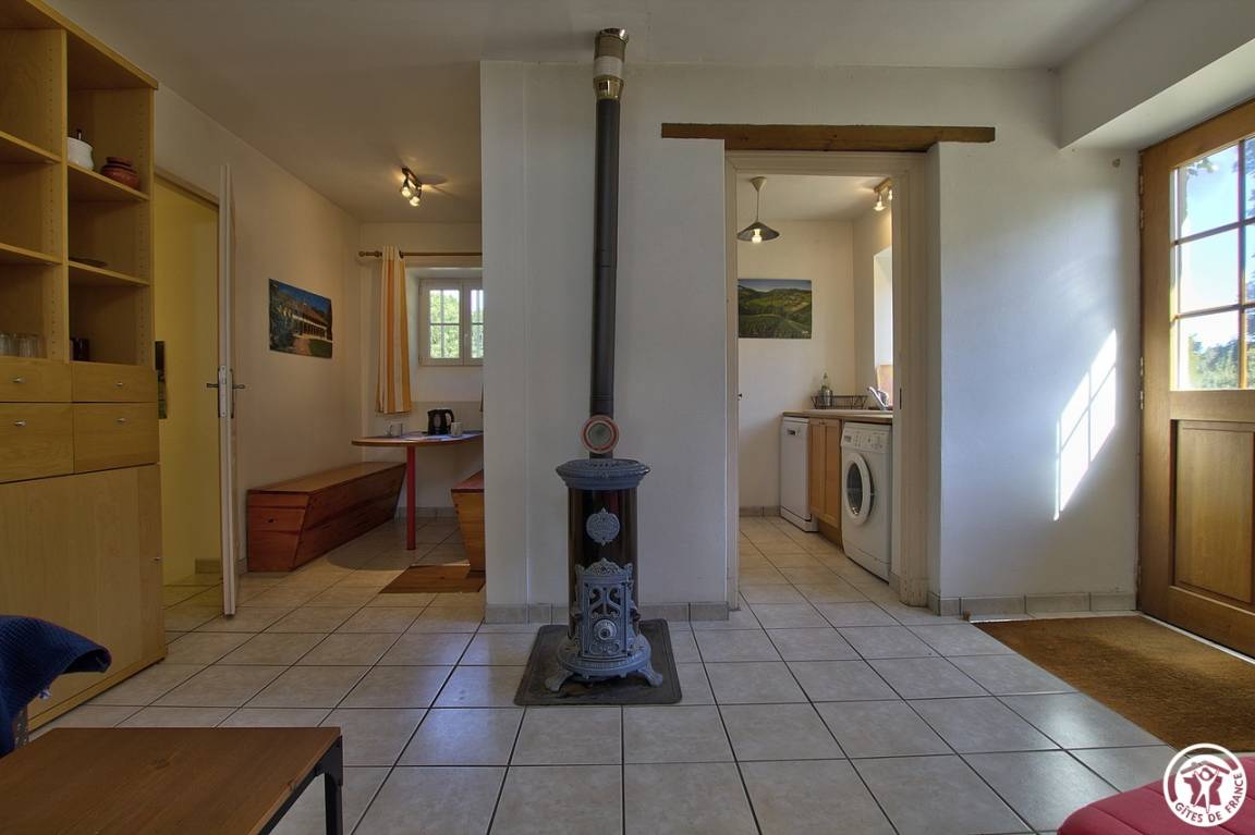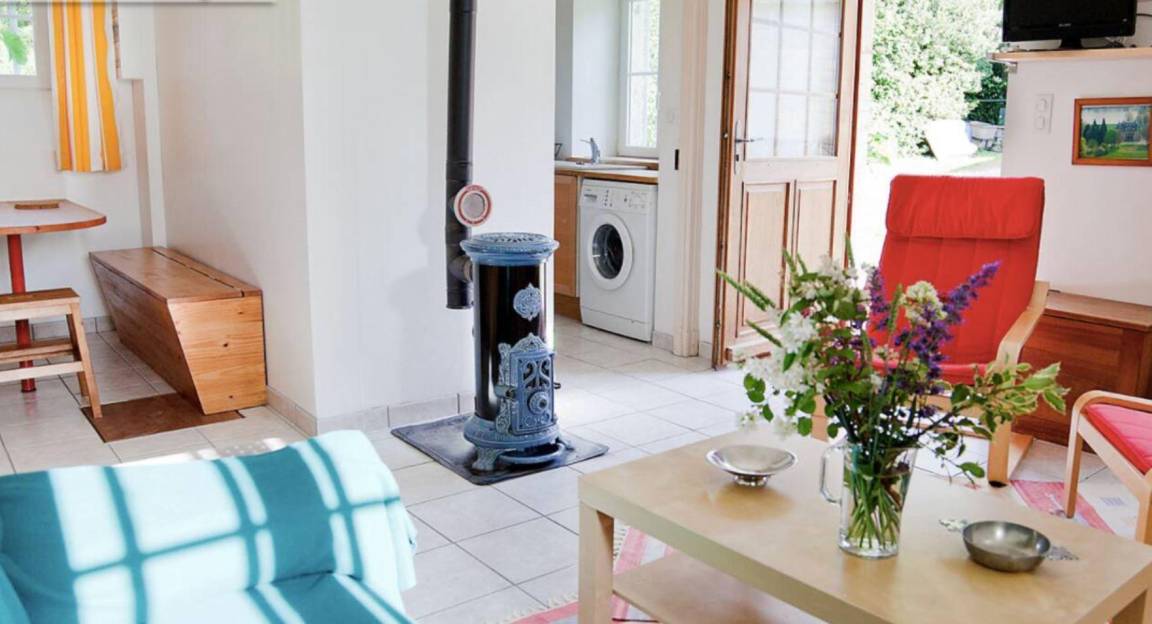Entdecken Sie das Innere dieses 48 m² großen Ferienhauses: Nach dem Erklimmen der vier Stufen der Veranda öffnet sich der Eingang zu einem hellen Wohnzimmer mit Holzofen, Küche und Essbereich.