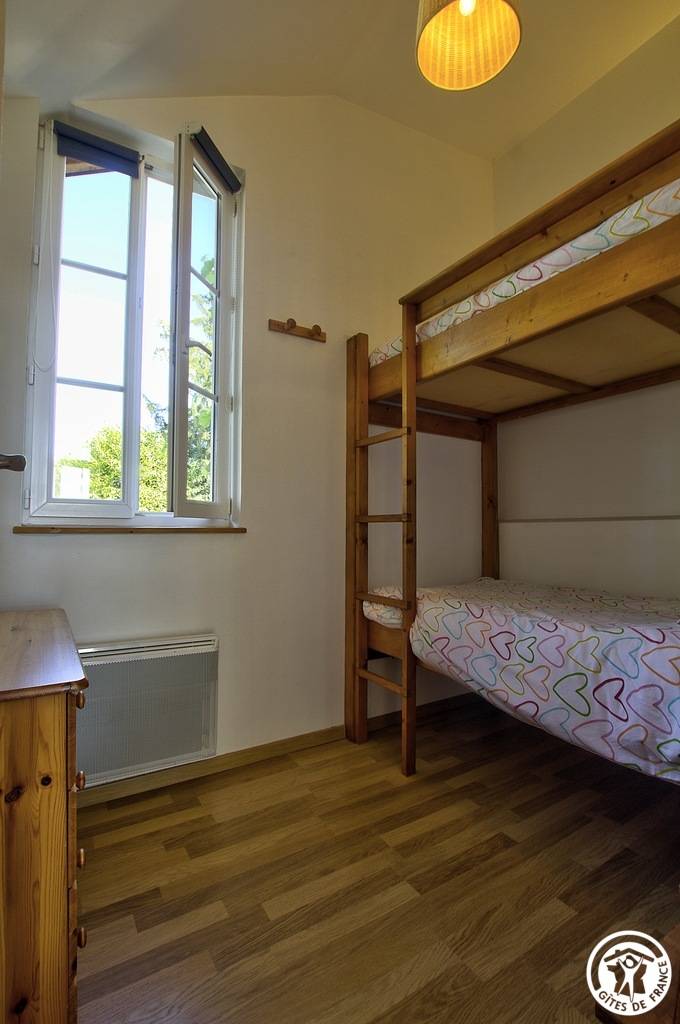 Auf der unteren Ebene, drei Stufen tiefer, finden Sie ein Schlafzimmer mit einem 160 x 200 cm großen Doppelbett mit direktem Zugang ins Freie, ein zweites Schlafzimmer mit zwei maßgefertigten Etagenbetten (80 x 180 cm) sowie ein kleineres Badezimmer und ein separates WC.