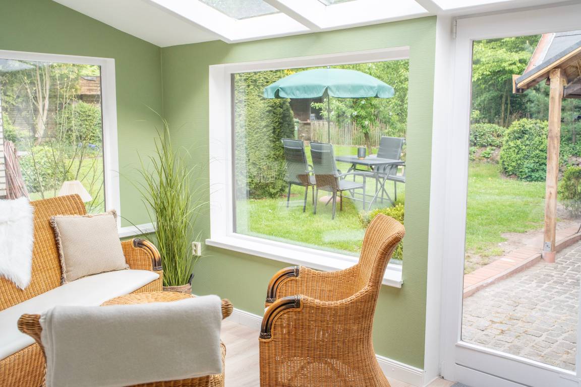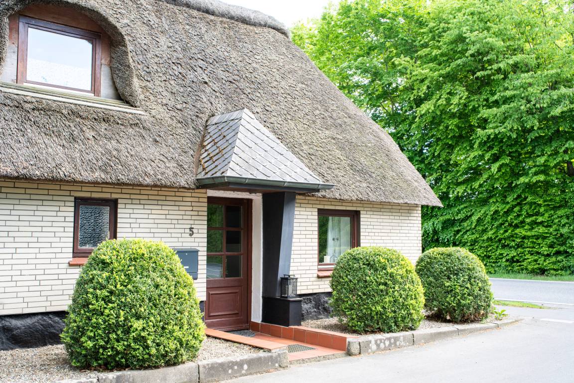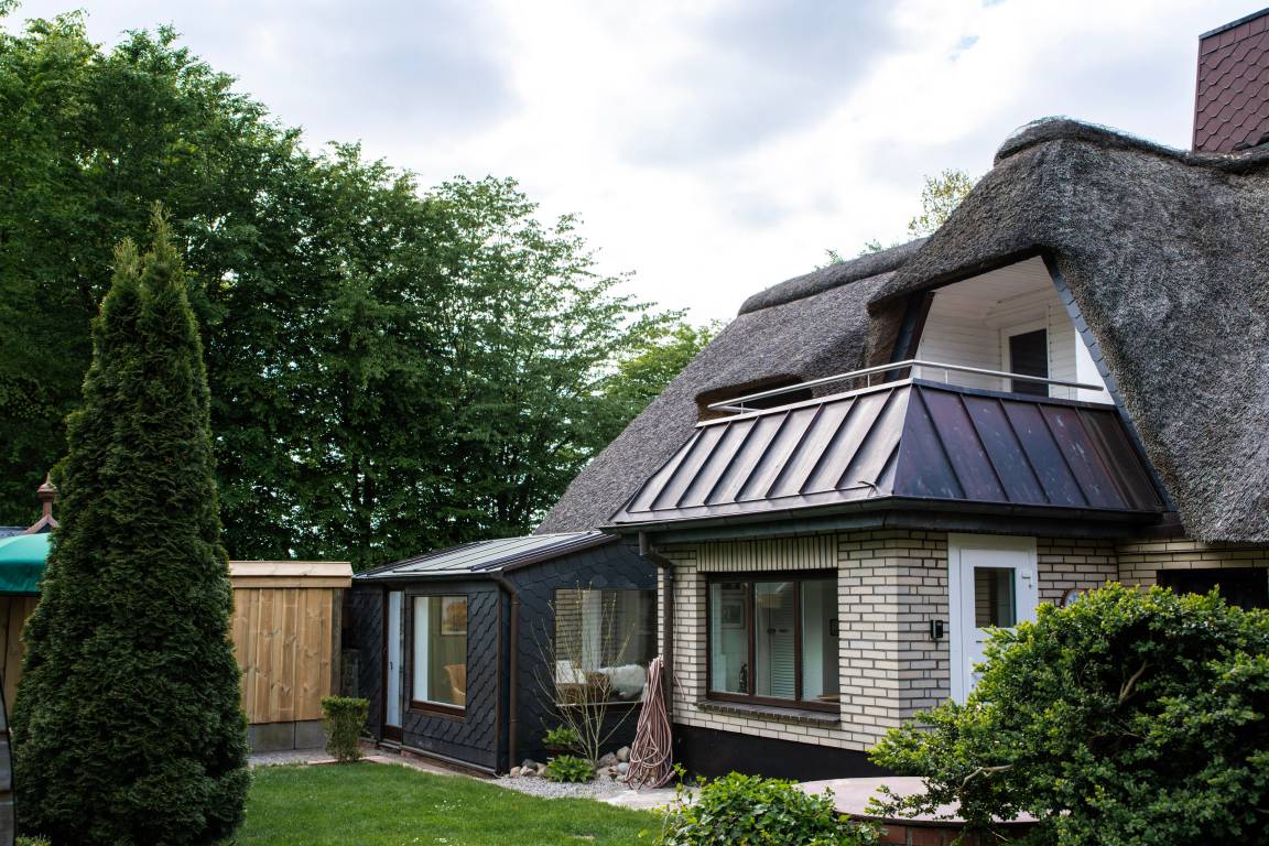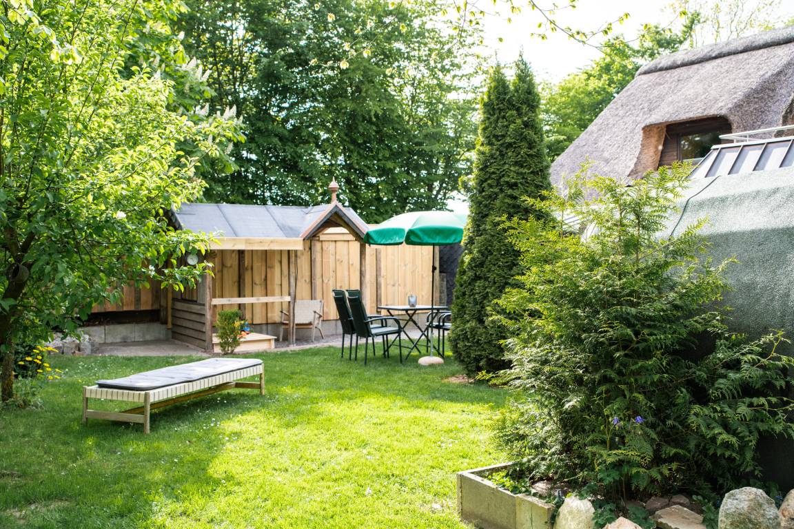 Gemütliche Ferienwohnung unter dem Reetdach in Jübek, zwischen Nord- und Ostsee. Für bis zu 5 Personen mit großem Garten und eingezäuntem Teich, Balkon, Grillecke, Sandkiste und Sauna. Perfekt für Familien, zum Fahrrad fahren, Wandern und zum Entspannen. Unsere Ferienwohnung befindet sich mitten in Schleswig-Holstein zwischen den Meeren. In einem alten Reetdach-Doppelhaus liegt unsere 100m² große Wohnung. Über den hinteren Eingangsbereich mit Garderobe und Waschmaschine kommen Sie in die gemütliche, gut ausgestattete Küche mit Essecke, die sich im Erdgeschoss befindet. Der Wohnbereich ist eingerichtet mit einem großen Ledersofa und TV-Gerät sowie mit einem Essbereich. Daran grenzt der Wintergarten mit Blick auf den großen Garten. Das Badezimmer ist ausgestattet mit Dusche/WC und Badewanne. Ein Haartrockner ist vorhanden. Im 1. Stock befindet sich ein Schlafzimmer mit einem Doppelbett (1,80 x 2,00m) und einem großen Kleiderschrank. Im zweiten Schlafzimmer stehen zwei Einzelbetten (0,90 x 2,00m) und eine kleine Kommode. Beide Räume verfügen über Verdunklungsplissees. Im angrenzenden offenen Wohnraum, über den auch der Balkon erreicht wird, befinden sich ein Schlafsofa und ein TV-Gerät. Das Badezimmer mit angrenzender Sauna verfügt über eine Dusche und ein WC. WLAN ist frei verfügbar. Handtücher sind einmalig pro Person inklusive. Ein Hochstuhl, ein abschließbarer Raum für Fahrräder und Endreinigung sind inklusive.