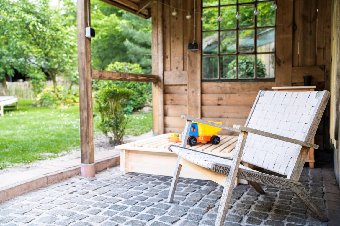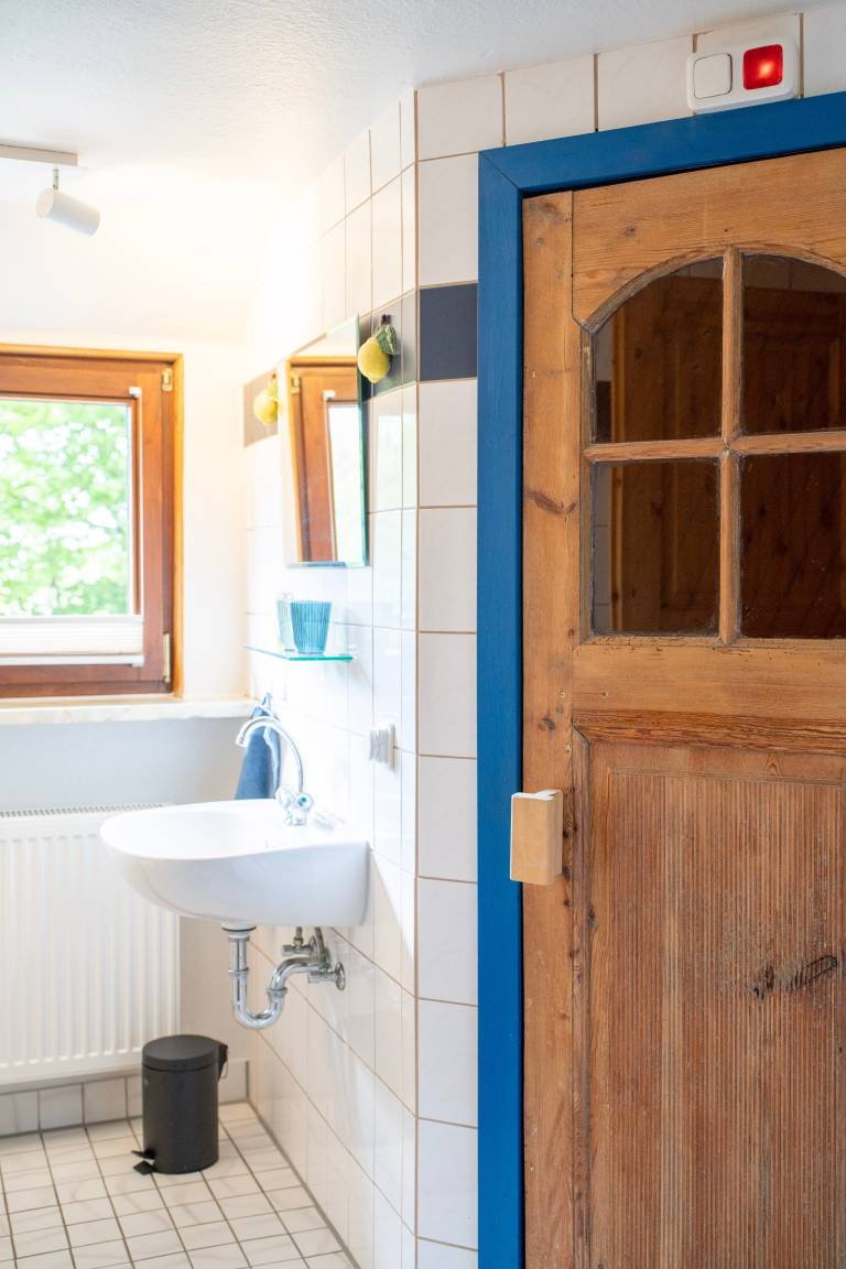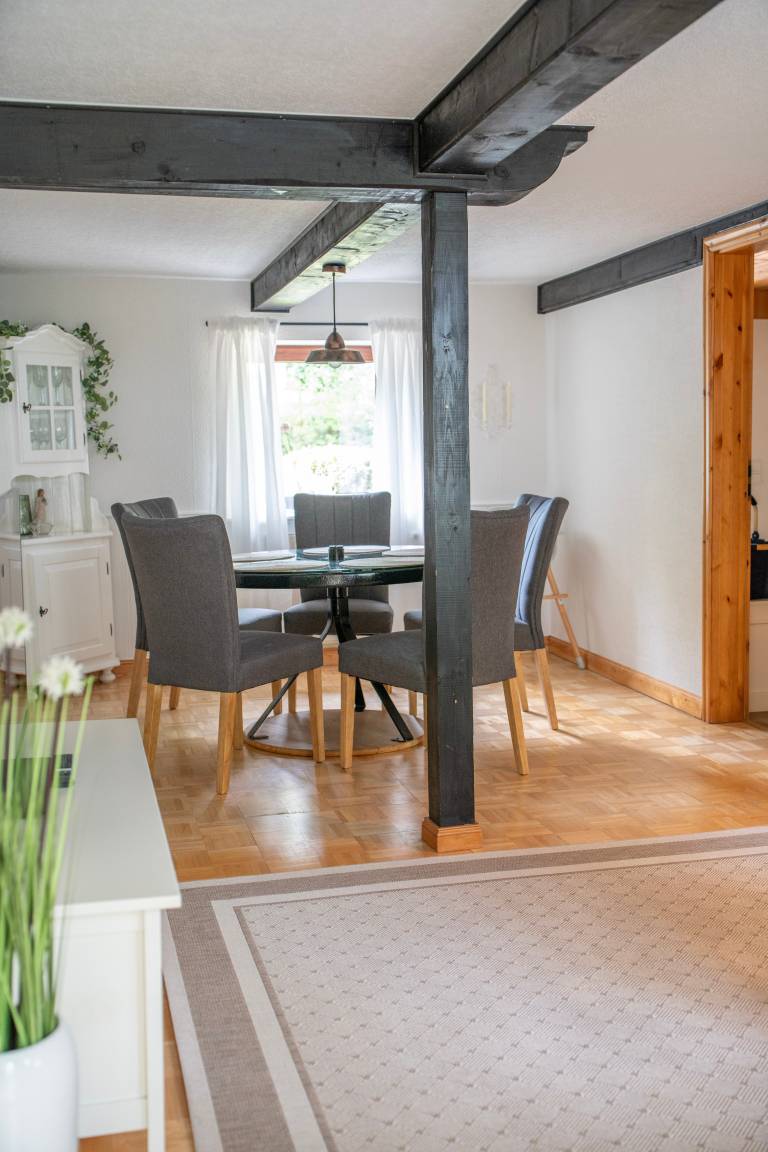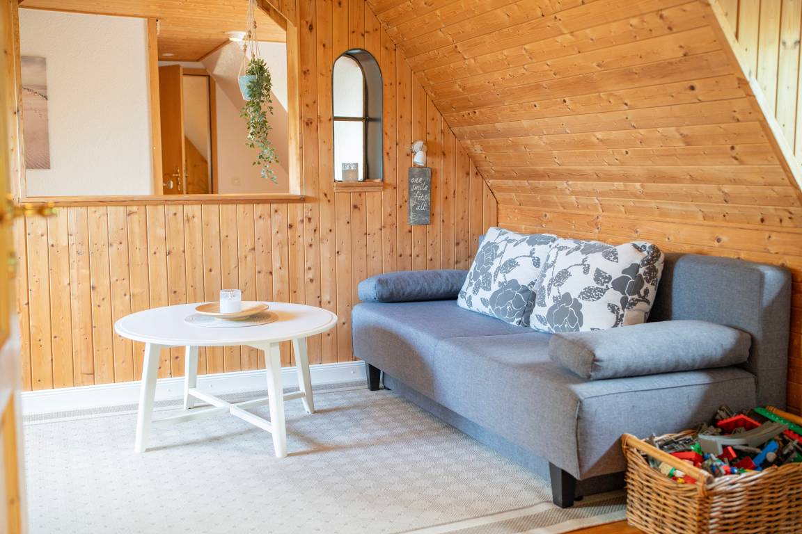 Gemütliche Ferienwohnung unter dem Reetdach in Jübek, zwischen Nord- und Ostsee. Für bis zu 5 Personen mit großem Garten und eingezäuntem Teich, Balkon, Grillecke, Sandkiste und Sauna. Perfekt für Familien, zum Fahrrad fahren, Wandern und zum Entspannen. Unsere Ferienwohnung befindet sich mitten in Schleswig-Holstein zwischen den Meeren. In einem alten Reetdach-Doppelhaus liegt unsere 100m² große Wohnung. Über den hinteren Eingangsbereich mit Garderobe und Waschmaschine kommen Sie in die gemütliche, gut ausgestattete Küche mit Essecke, die sich im Erdgeschoss befindet. Der Wohnbereich ist eingerichtet mit einem großen Ledersofa und TV-Gerät sowie mit einem Essbereich. Daran grenzt der Wintergarten mit Blick auf den großen Garten. Das Badezimmer ist ausgestattet mit Dusche/WC und Badewanne. Ein Haartrockner ist vorhanden. Im 1. Stock befindet sich ein Schlafzimmer mit einem Doppelbett (1,80 x 2,00m) und einem großen Kleiderschrank. Im zweiten Schlafzimmer stehen zwei Einzelbetten (0,90 x 2,00m) und eine kleine Kommode. Beide Räume verfügen über Verdunklungsplissees. Im angrenzenden offenen Wohnraum, über den auch der Balkon erreicht wird, befinden sich ein Schlafsofa und ein TV-Gerät. Das Badezimmer mit angrenzender Sauna verfügt über eine Dusche und ein WC. WLAN ist frei verfügbar. Handtücher sind einmalig pro Person inklusive. Ein Hochstuhl, ein abschließbarer Raum für Fahrräder und Endreinigung sind inklusive.