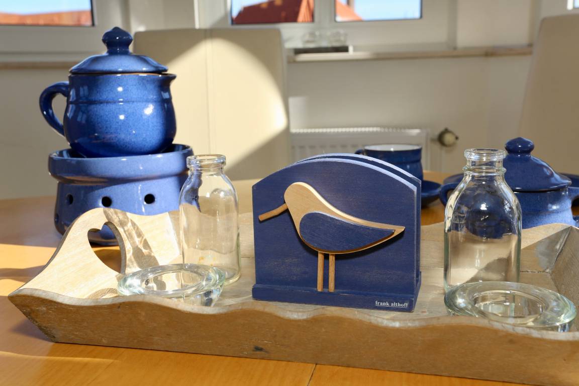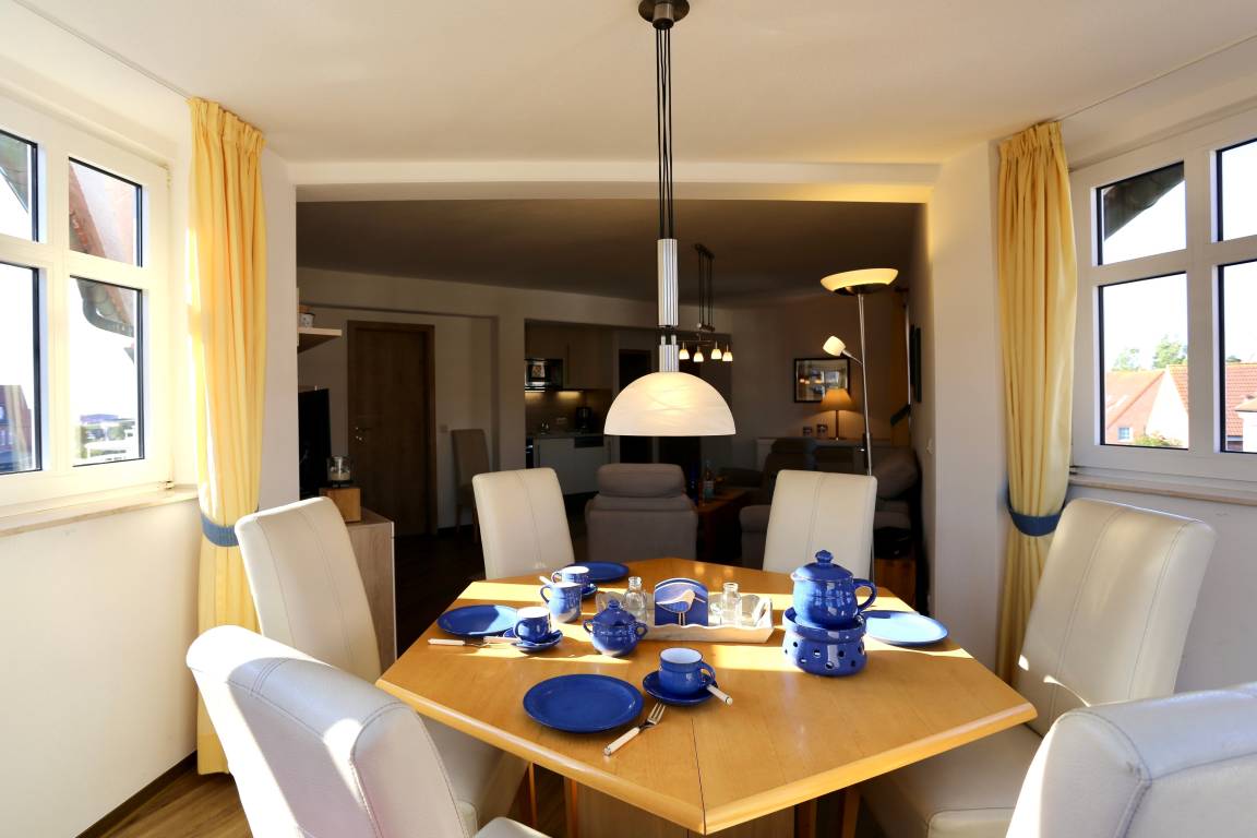 Die Wohnung liegt im zweiten Stock im Turm und bietet einen wundervollen Rundumblick über den Kern von Juist.