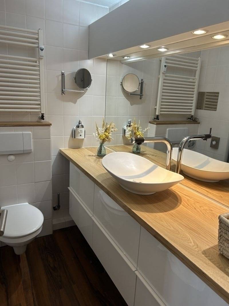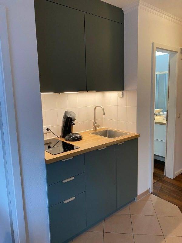 Das im September 2023 renovierte Appartement bietet ausreichend Platz für bis zu 4 Personen. Es liegt in der 1. Etage und ist bequem mit dem Aufzug zu erreichen. Die Ferienwohnung verfügt über einen ansprechend gestaltetes Wohn-/Esszimmer mit Küchenzeile und optisch abgetrenntem Schlafbereich, ein separates Schlafzimmer mit Etagenbett und Zugang zum Balkon und ein Duschbad. Handtücher, Bademäntel und Bettwäsche werden von der Unterkunft gestellt. Die Küchenzeile ist mit Kaffeeautomat, Kühlschrank und Spülmaschine ausgestattet. Der Sat-Fernseher ist so schwenkbar, dass er sowohl vom Bett als auch vom Sofa aus zu sehen ist. WLAN ist selbstverständlich in der Unterkunft verfügbar und im Preis inbegriffen.