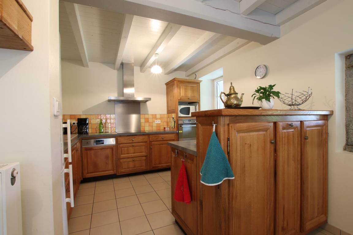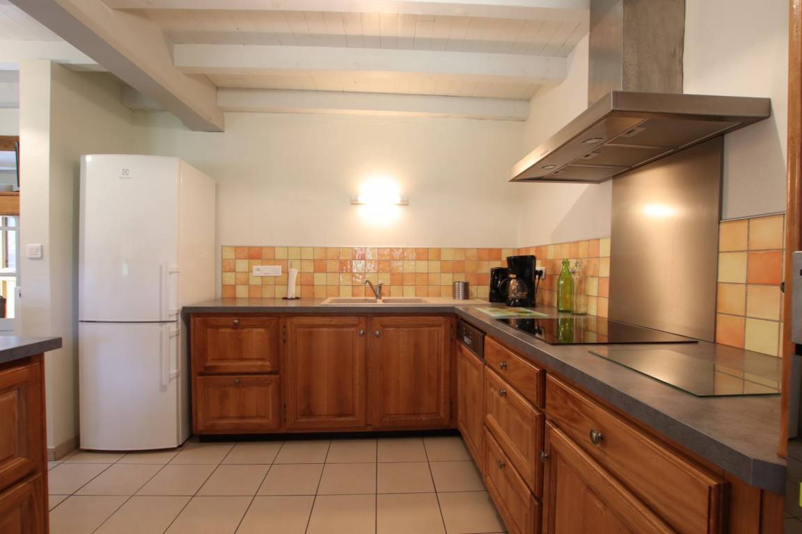 Erdgeschoss: Ausgestattete Küche (Induktionskochfeld, Backofen und Mikrowelle, Geschirrspüler, Kühl-Gefrierkombination).