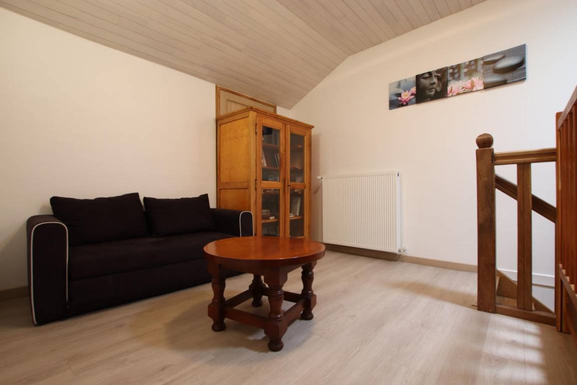 Großes, in ein Wohnzimmer umgewandeltes Zimmer mit Holzofen und TV. Es verfügt über 2 Schlafzimmer: 2 140 cm breite Betten.