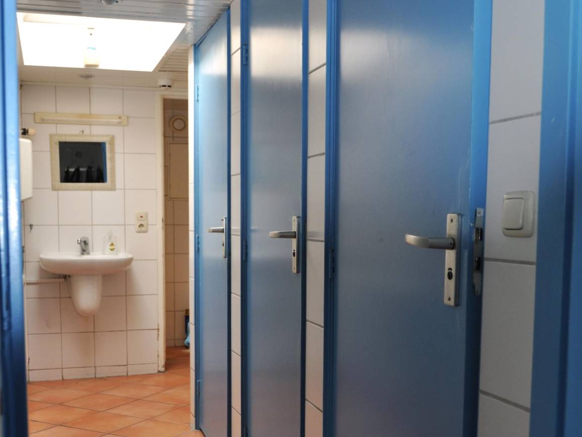 Layout : Parterre: Eingang, Wohnzimmer mit TV(Flatscreen), Kamin, Sitzecke(20 Personen), Bar(mit Zapfhahn) , Esszimmer mit 7x Esstisch(80 Personen), Beamer , Küche mit Wasserkocher, Kochherd(8 Kochplatten, Gas), Dunstabzugshaube, Kaffeemaschine(Filter), Backofen(Dampf), Geschirrspüler, 2x Kühlschrank, Tiefkühlschrank , Schlafzimmer mit Badezimmer(von außen erreichbar, auf dem Gelände) mit 3x Etagenbett(90 x 200 cm), Dusche, Waschbecken, Toilette , Schlafzimmer mit Badezimmer(von außen erreichbar, auf dem Gelände) mit 3x Etagenbett(90 x 200 cm), Dusche, Waschbecken, Toilette , Sanitärraum mit Waschbecken, 4x Toilette