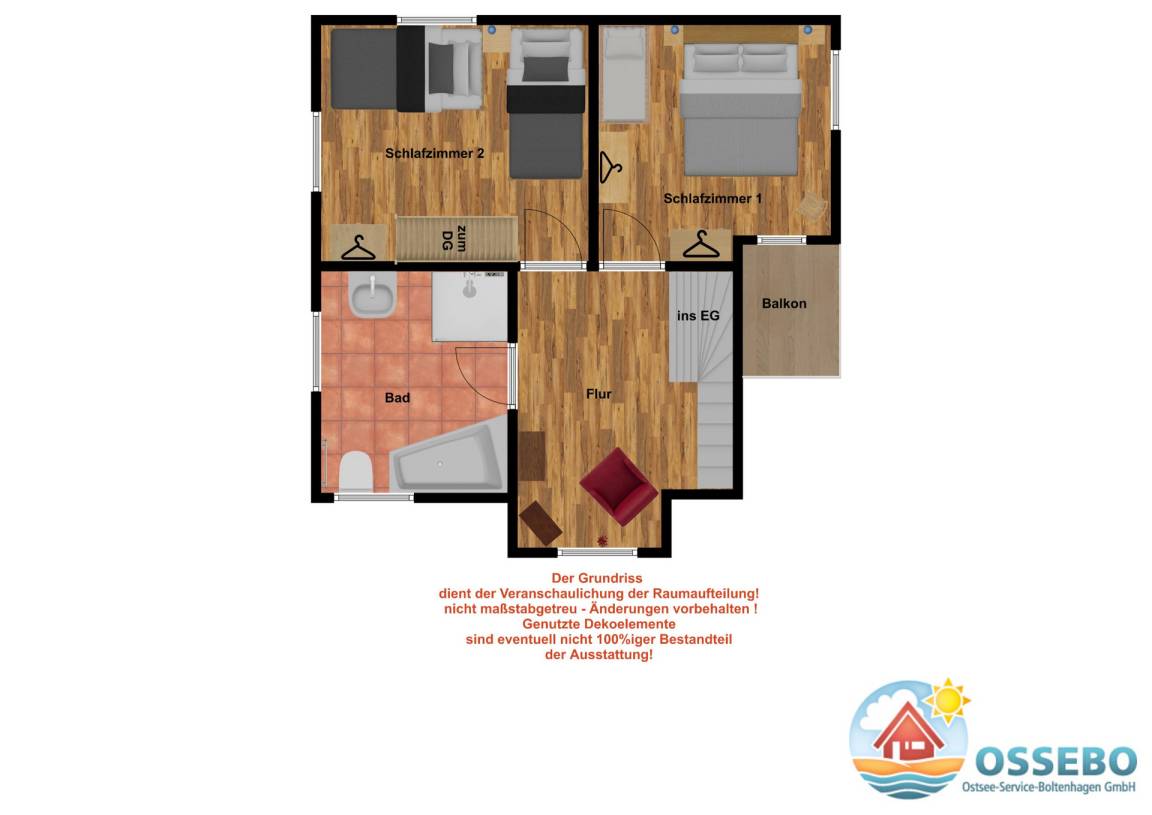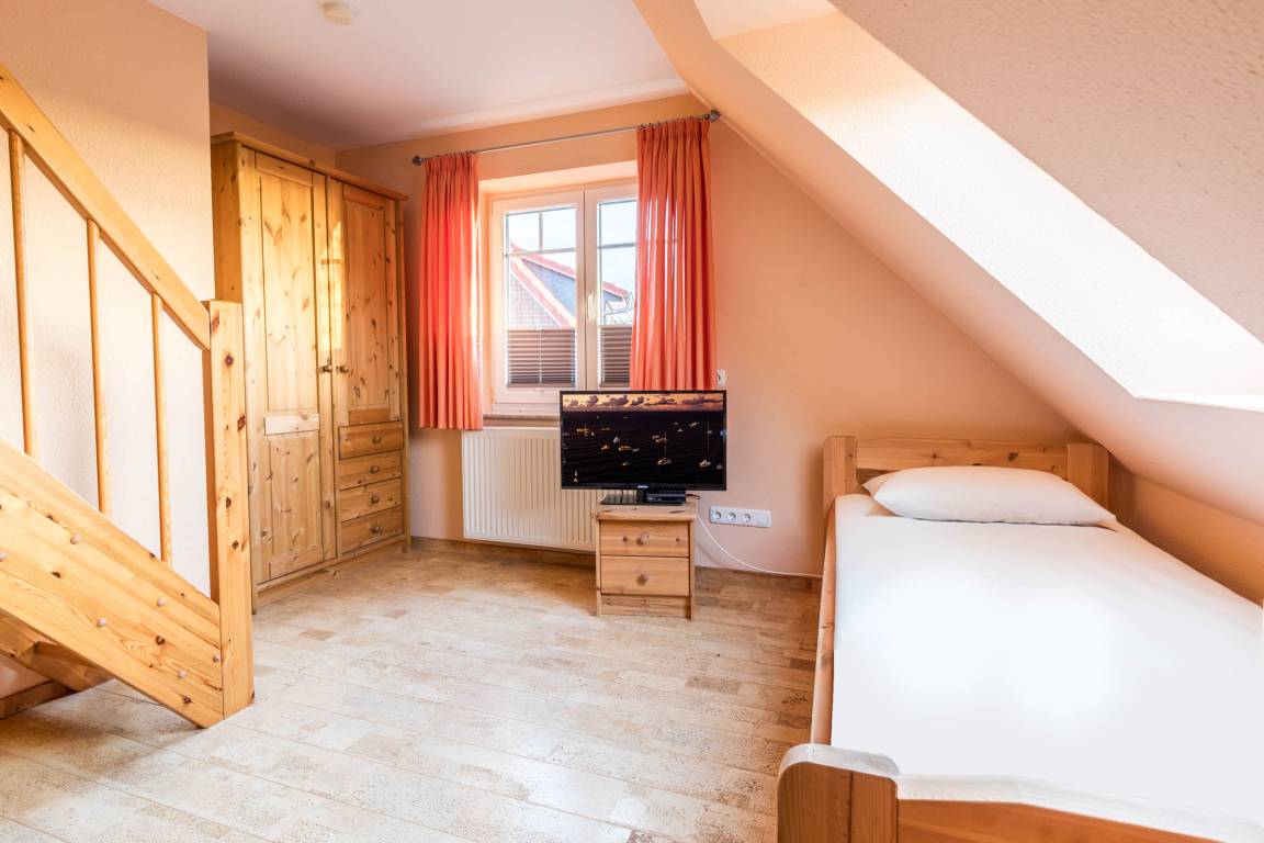 Weiterhin finden Sie auf der oberen Etage zwei separate Schlafräume. Das große Schlafzimmer ist mit einem Doppelbett, einem festen Holzgitterbett, einer Kommode sowie einem Kleiderschrank ausgestattet. Im Gäste-/ Kinderzimmer befinden sich zwei Einzelbetten, ein Kleiderschrank, ein eigenes TV-Gerät und ein DVD-Player.