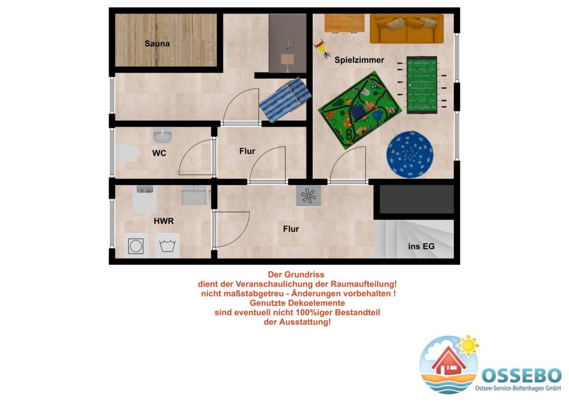 In diesem schmucken Feriendomizil kann auch das Kellergeschoss genutzt werden: Hier erwartet Sie u.a. ein 23 m² großes Spielzimmer, das mit 2 normalen Fenstern mit Rollläden versehen ist. Für den Spielspaß sorgen ein Tischkicker, zwei Matratzen zum ausgiebigen Toben sowie ein Ballhaus.