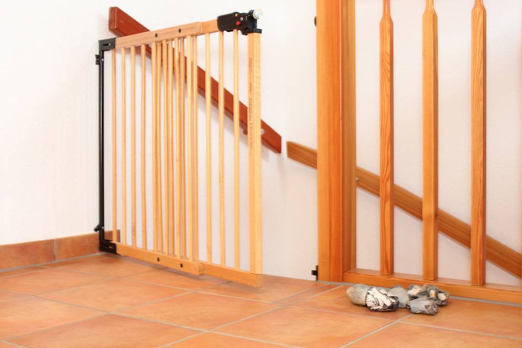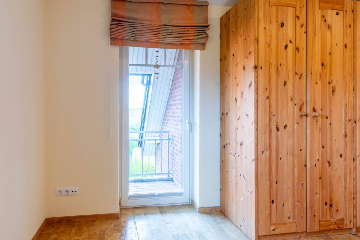 Von hier aus führt eine Holztreppe ins 1. Obergeschoss, wo sich im Friesengiebel ein schöner Sessel und eine kleine Kommode befinden - ein kleiner Rückzugsort, wenn man etwas Entspannung und Ruhe sucht. Am oberen Ende der Treppe ist ein Treppenschutzgitter befestigt.