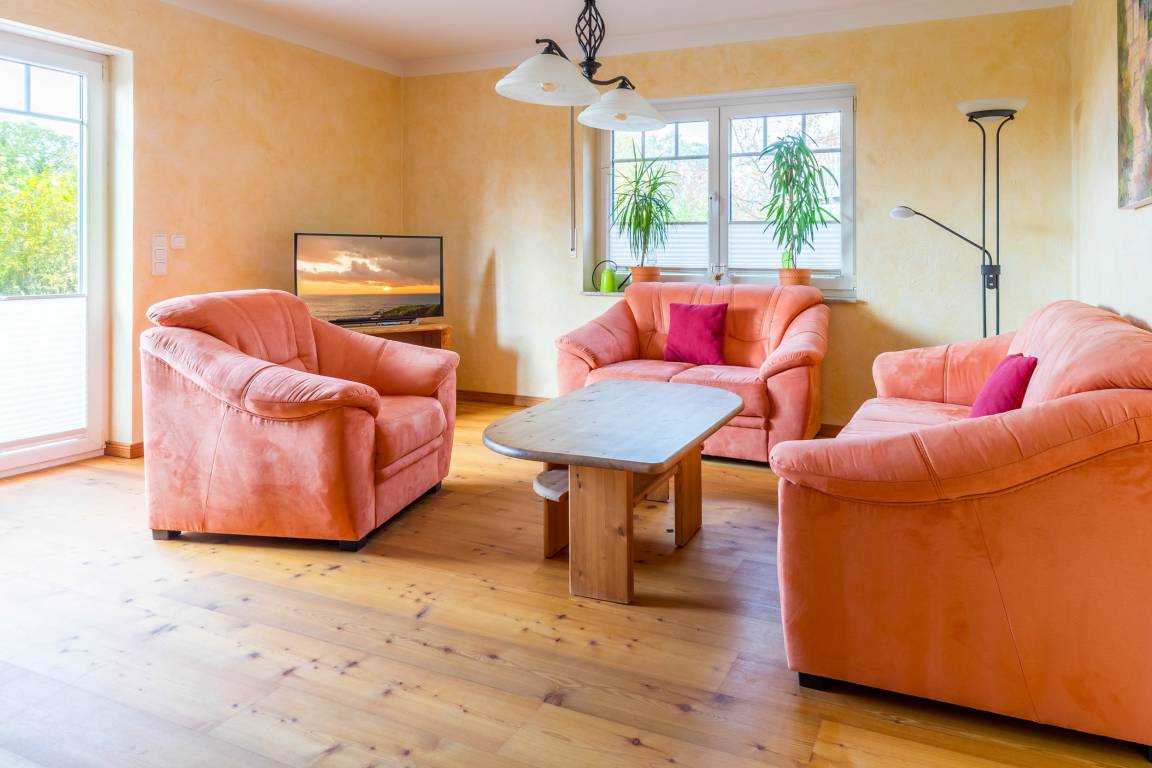 Der Wohnbereich im Erdgeschoss wartet unter anderem mit einem wunderschönen Kaminofen, zwei Sofas und einem Sessel auf – perfekt für den abendlichen Ausklang nach einem ereignisreichen Tag an der Ostsee.