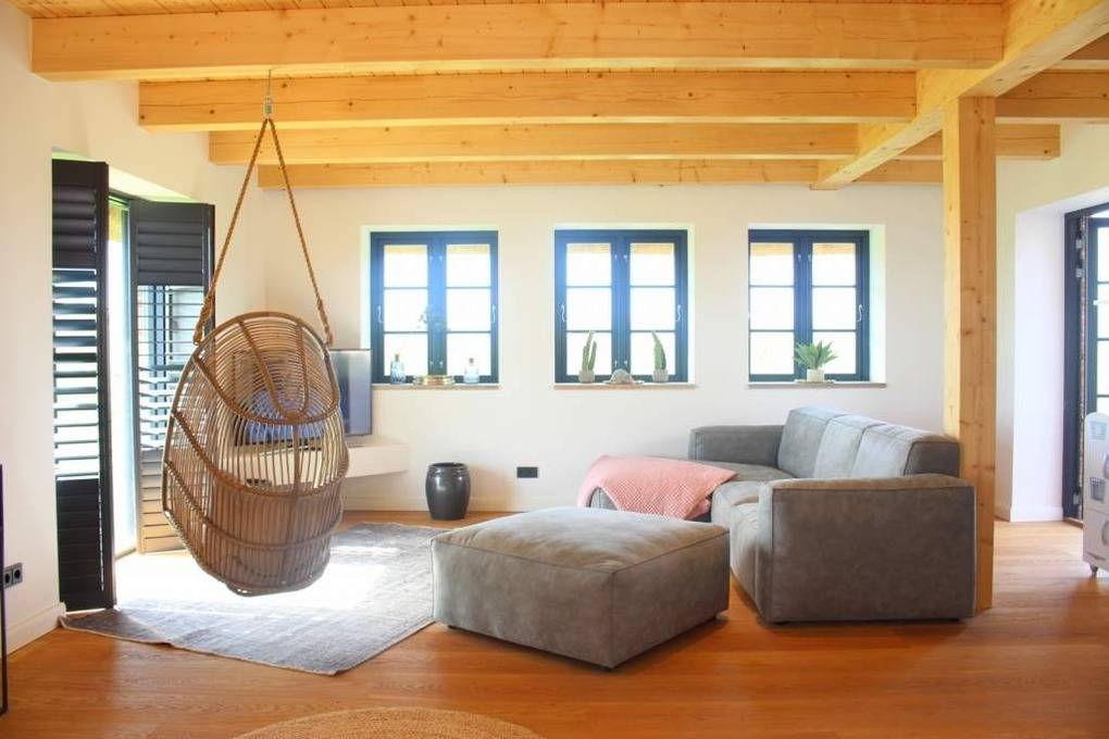 Die vielen und großen Fensterelemente sorgen für viel Licht und ein tolles Raumgefühl. Der Blick ins Grüne lässt Urlaubsfreude aufkommen. Zeitlose Klassiker mit modernem Twist erwarten Sie im gesamten Haus.