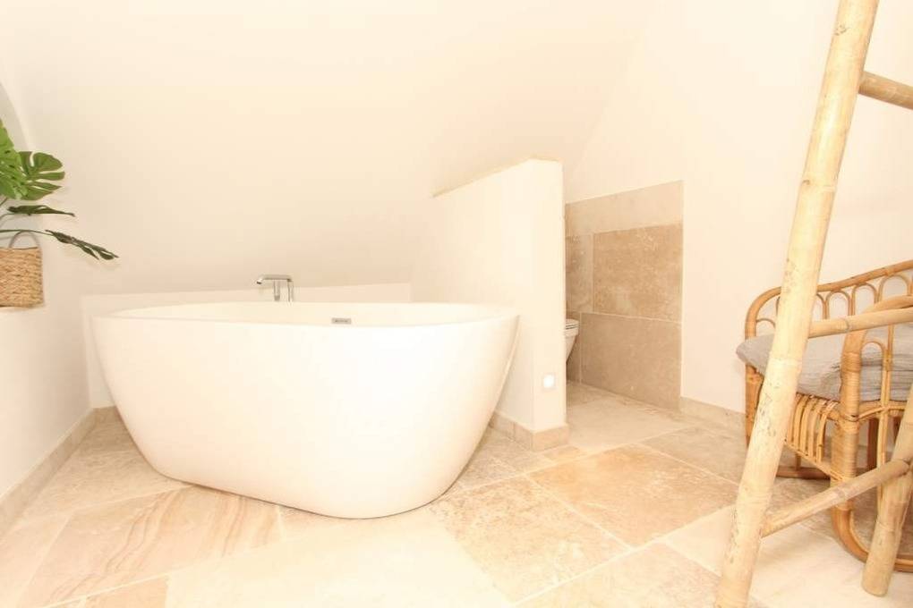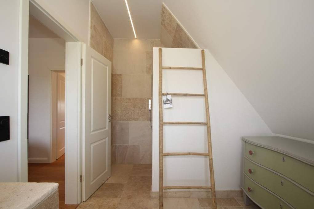 Im größeren Badzimmer auf dieser Wohnebene befindet sich neben dem Waschtisch, auch ein WC sowie eine freistehende Badewanne. Das andere Badezimmer ziert eine Dusche und ein Waschtisch mit WC.