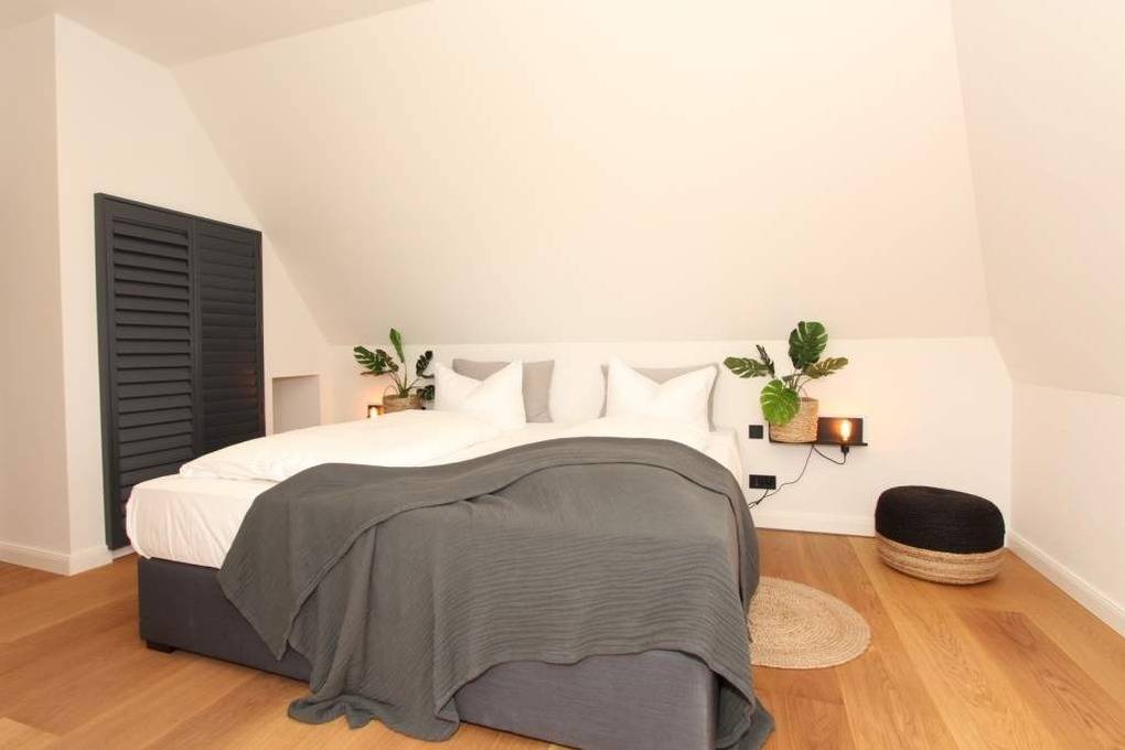 Ein Schlafzimmer mit Boxspringbett 180x200cm und ein passender Kleiderschrank erwarten Sie ebenfalls, wie auch das Badezimmer mit Doppelwaschtisch, WC und Dusche.
