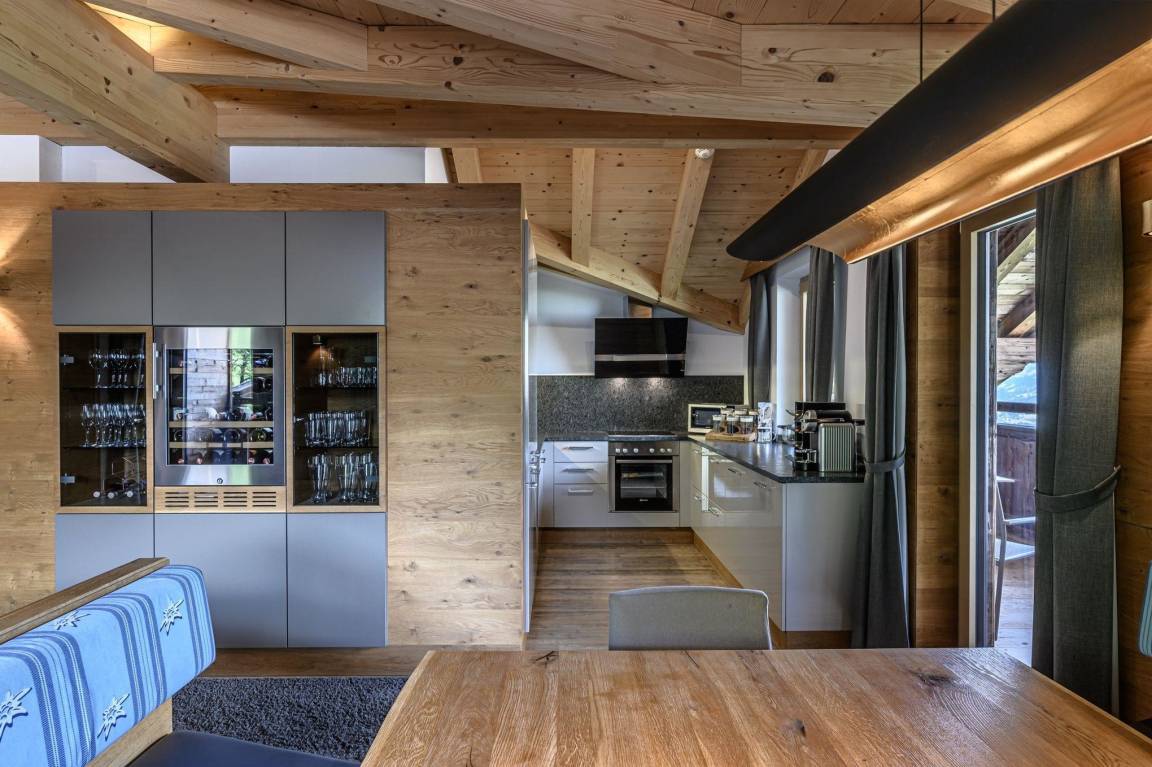 In der vollausgestatteten Küche mit Nespresso-Maschine, Mikrowelle, Herd, Backofen, Geschirr und weitere Utensilien, können Sie köstliche Mahlzeiten zubereiten und diese gemeinsam am Esstisch speisen.