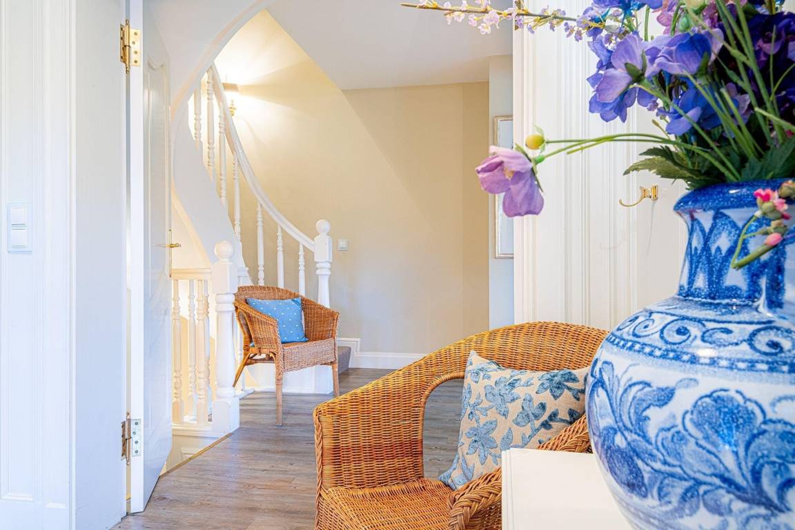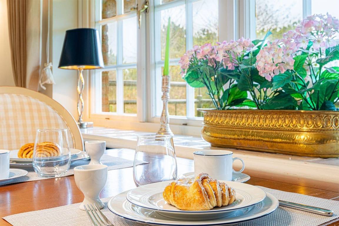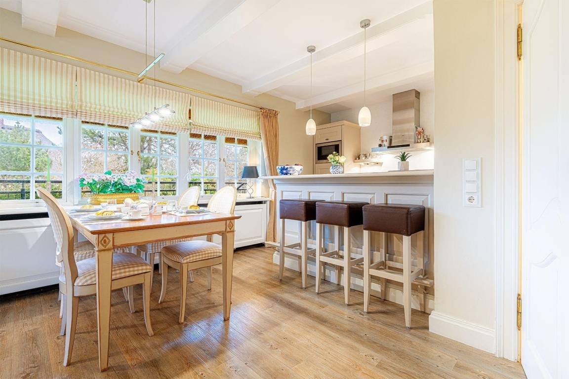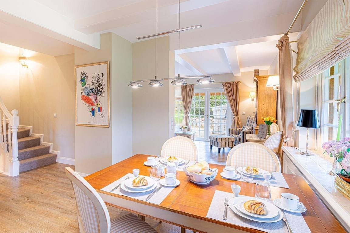 In diesem charmanten Reetdach-Endhausteil in Kampen auf Sylt erwartet die Gäste ein stilvolles Ambiente. Der großzügige Wohnbereich, ausgestattet mit einer gemütlichen Sofalandschaft und einem Kamin, bietet einladende Stunden. Die offene Küche verfügt über alle notwendigen Geräte für die komfortable Zubereitung von Mahlzeiten, während der angrenzende Esstisch Platz für gemeinsame Essen bietet. Im Erdgeschoss stehen ein Gäste-WC und eine praktische Garderobe bereit.