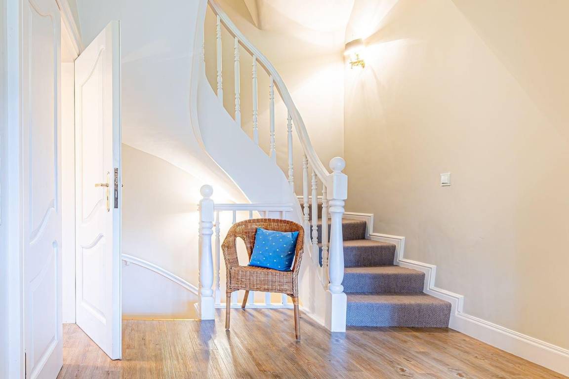 Das Obergeschoss beherbergt ein geräumiges Schlafzimmer mit einem Doppelbett (1,80 x 2,00 Meter) sowie ein zweites Schlafzimmer mit einem Kojen-Bett (1,40 x 2,00 Meter), beide mit einem modernen Bad En-Suite. Im Untergeschoss befindet sich ein weiteres Schlafzimmer mit eigenem Bad En-Suite und eine großzügige Waschküche mit Miele Waschmaschine und Trockner, ideal für Familien oder Gruppen.