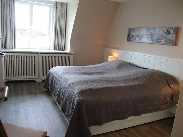 Geräumiges Schlafzimmer mit Blick in die Dünen mit komfortablem King-Size Bett, grossen Schränken und Flatscreen-TV.