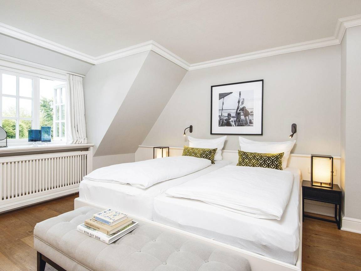 Gemütlichkeit trifft Stil - ein schönes Hausteil für Vier zentrumsnah und doch ruhig gelegen. Von der Haustür haben Sie sofort den Durchblick bis in den Garten mit Terrasse und Strandkorb zur Sonnenseite Süden. Das Erdgeschoss erfreut mit separater Küche und kombiniertem Wohn-/Essbereich in eleganten Naturtönen mit kleinen Farbakzenten mit gemütlichen Polstermöbeln, Kamin und schönem Esstisch für gemütliche Runden. Das helle Untergeschoss bietet ein Doppelschlafzimmer mit großen Einbauschränken und gleich nebenan ein Wannenbad. Ein großes Schlafzimmer mit Gartenblick und ein modernes Duschbad befinden sich im Obergeschoss. Das Quartier ist mit Terracotta- und Holzfußböden ausgestattet.
