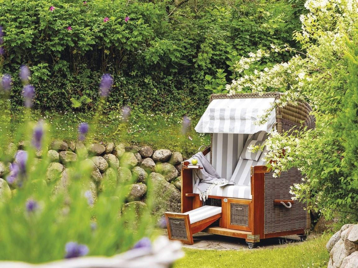 Gemütlichkeit trifft Stil - ein entzückendes Hausteil für Vier zentrumsnah und doch ruhig gelegen. Von der Haustür haben Sie sofort den Durchblick bis in den Garten mit Terrasse und Strandkorb zur Sonnenseite Süden. Das Erdgeschoss erfreut mit separater Küche und kombiniertem Wohn-/Essbereich in eleganten Naturtönen mit kleinen Farbakzenten mit gemütlichen Polstermöbeln, Kamin und schönem Esstisch für gemütliche Runden. Das hell gestaltete Untergeschoss bietet ein Doppelschlafzimmer mit großen Einbauschränken und gleich nebenan ein Wannenbad. Ein großes Schlafzimmer mit Gartenblick und ein modernes Duschbad befinden sich im Obergeschoss. Das Quartier ist mit Terracotta- und Holzfußböden ausgestattet.